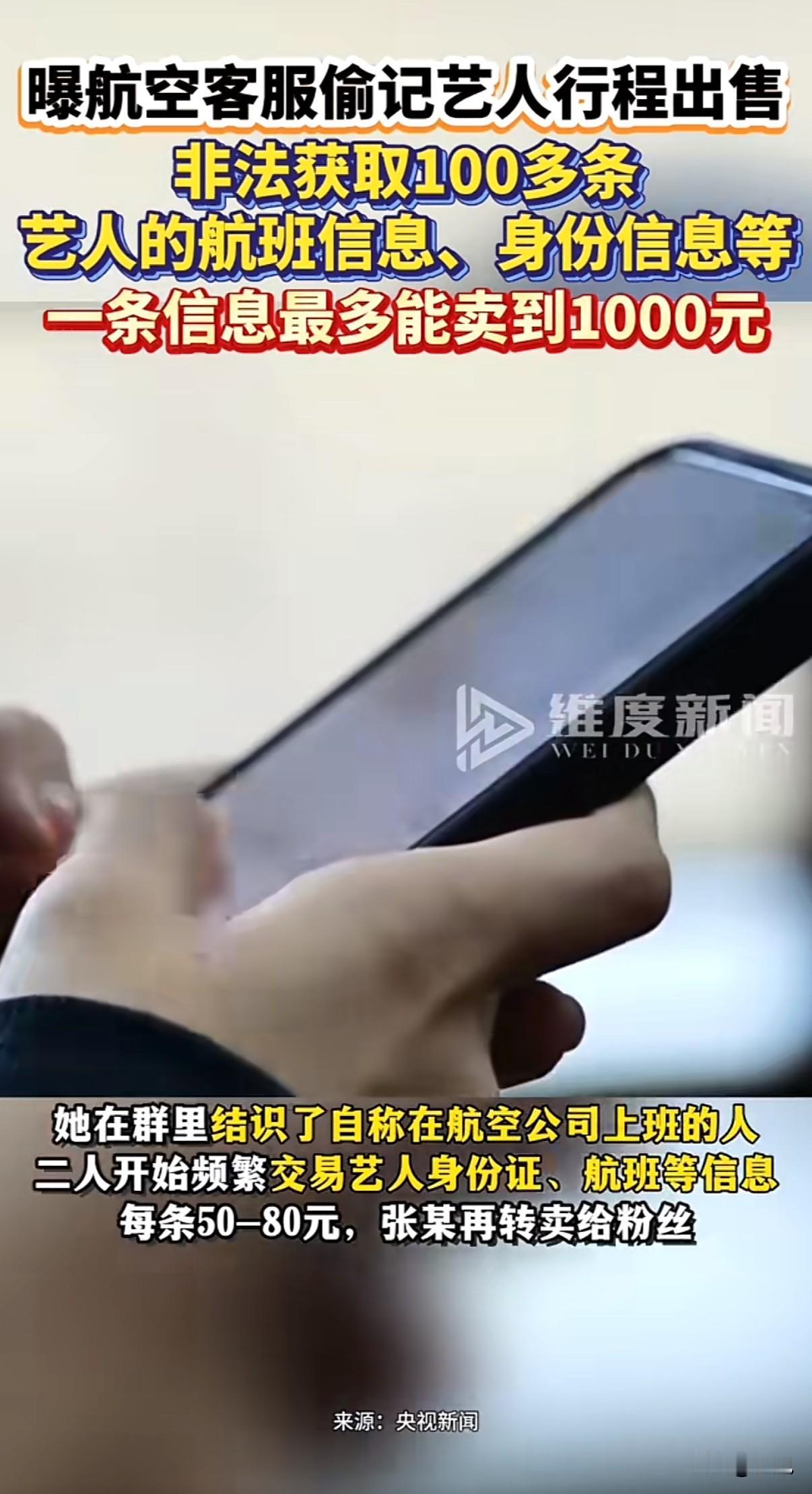 航空公司外包客服用手写纸条偷记明星行程,一条信息最高卖到1000元。 这事最近被央视曝光了。有个叫张某的姑娘,原本就是个普通追星族,经常去机场拍明星。后来找她拍照的人越来越多,她就开始收费代拍。 她在代拍群里认识了个自称在航空公司上班的人。这人真名叫舒某,其实是在航空公司外包的客服公司工作。公司规定上班不能带手机,怕员工录音录像泄露信息。 可舒某真有办法。她每天登录航空公司购票系统,把查到的明星身份证号、航班信息都用笔写在纸上,然后趁主管不注意偷偷带出去。 她把每条信息以50到80元卖给张某。张某转头就加价卖给其他粉丝,根据明星火的程度定价,最贵的能卖到1000元一条。 张某在法庭上说出了很多人的心态:“他也是跟我说是自己追星,所以我想大家都分摊一下追星的成本”。就是这种想法,让她在这条路上越走越远。 一年多时间里,舒某卖了100多条明星信息,赚了13100元。张某转手倒卖,赚了2万多。 现在两人都被判刑了。舒某被判了十个月缓刑,罚了款,还被禁止在缓刑期间从事航空客服工作。张某也被判了七个月,罚了款。 这事背后其实是条完整的产业链:内部人员利用职务偷信息——中间商加价转卖——粉丝或代拍购买。 现在这些卖信息的人变得更隐蔽了,改用“飞机”符号、“HB”这样的暗语来交易。记者试了下,花3块钱就能买到一位明星近期的详细航班信息。 这种交易看似你情我愿,实际上已经违法了。不仅侵犯明星隐私,还经常导致机场拥堵,影响其他旅客。 法院这次判决给出了明确信号:无论什么理由,买卖公民个人信息都是不被法律允许的。每个行业都有职业底线,突破了底线就要付出代价。