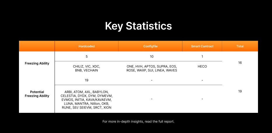 Bybit旗下LazarusSecurityLab发布报告称,在审查166条区块链网络后,发现16条链已具资金冻结能力,另有19条在小幅修改协议后也可实现冻结。冻结机制包括硬编码(如BNBChain、VeChain)、配置文件控制(如Sui、Aptos)和合约执行(如HECO)。报告指出,部分链已在安全事件中启动冻结措施,例如Sui冻结1.62亿美元被盗资产,BNBChain拦截5.7亿美元跨链桥漏洞资金。