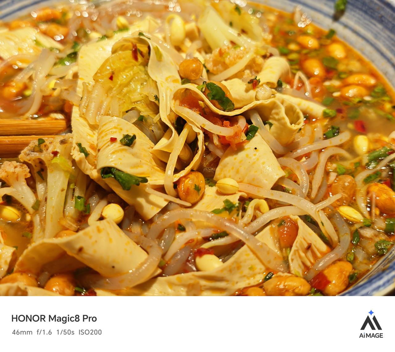 来一组用荣耀Magic8 Pro随手拍的美食照,个人觉得在色彩上还是比较自然,没有刻意的去加色,本来肚子不是那么饿,结果看了照片食欲大增,额外点了份麻辣烫。