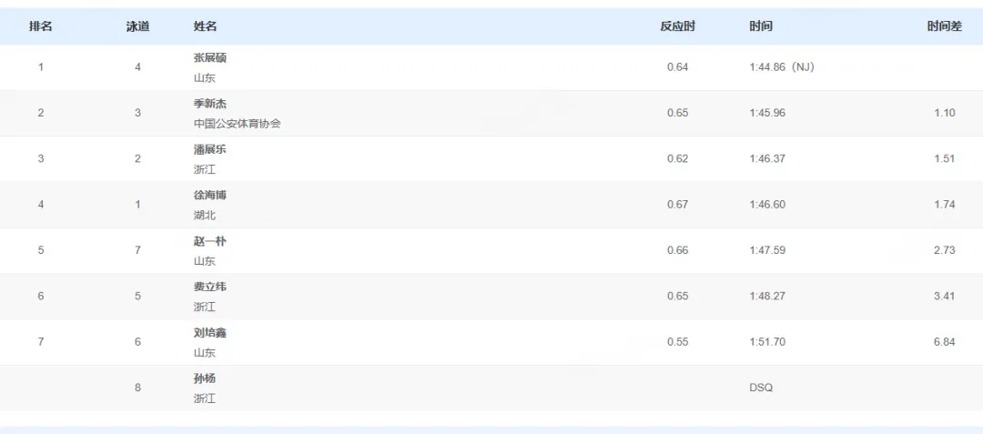 11月12日,全运会男子200米自由泳决赛,张展硕赢得全运会男子200米自由泳冠军,成绩为1分44秒86。季新杰获得亚军,潘展乐拿到铜牌。