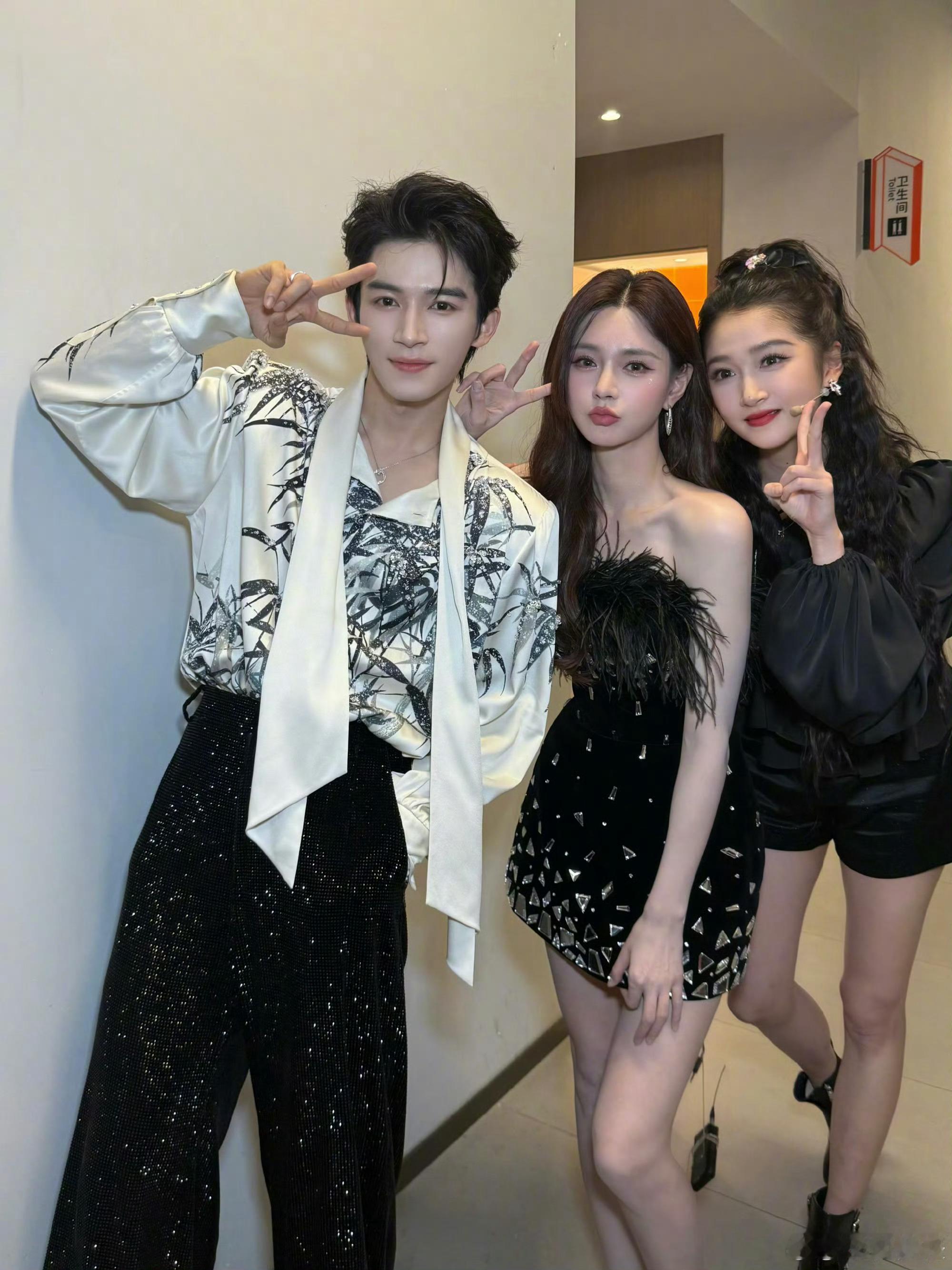 沈梦辰晒出在后台跟关晓彤、王星越合影,照片中三人紧挨站立,沈梦辰居中,关晓彤挽其手臂,王星越在旁比“耶”手势,笑容自然。