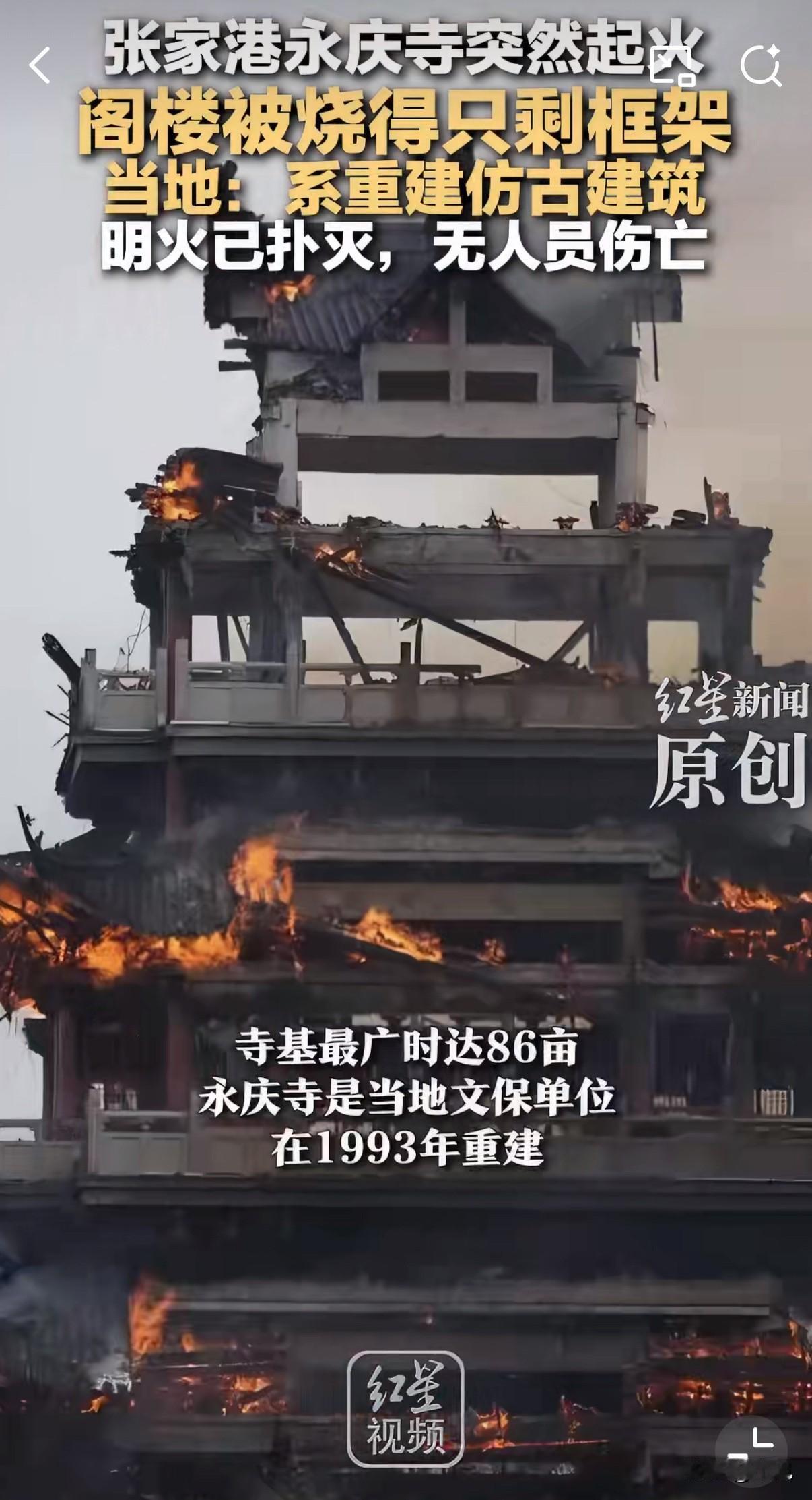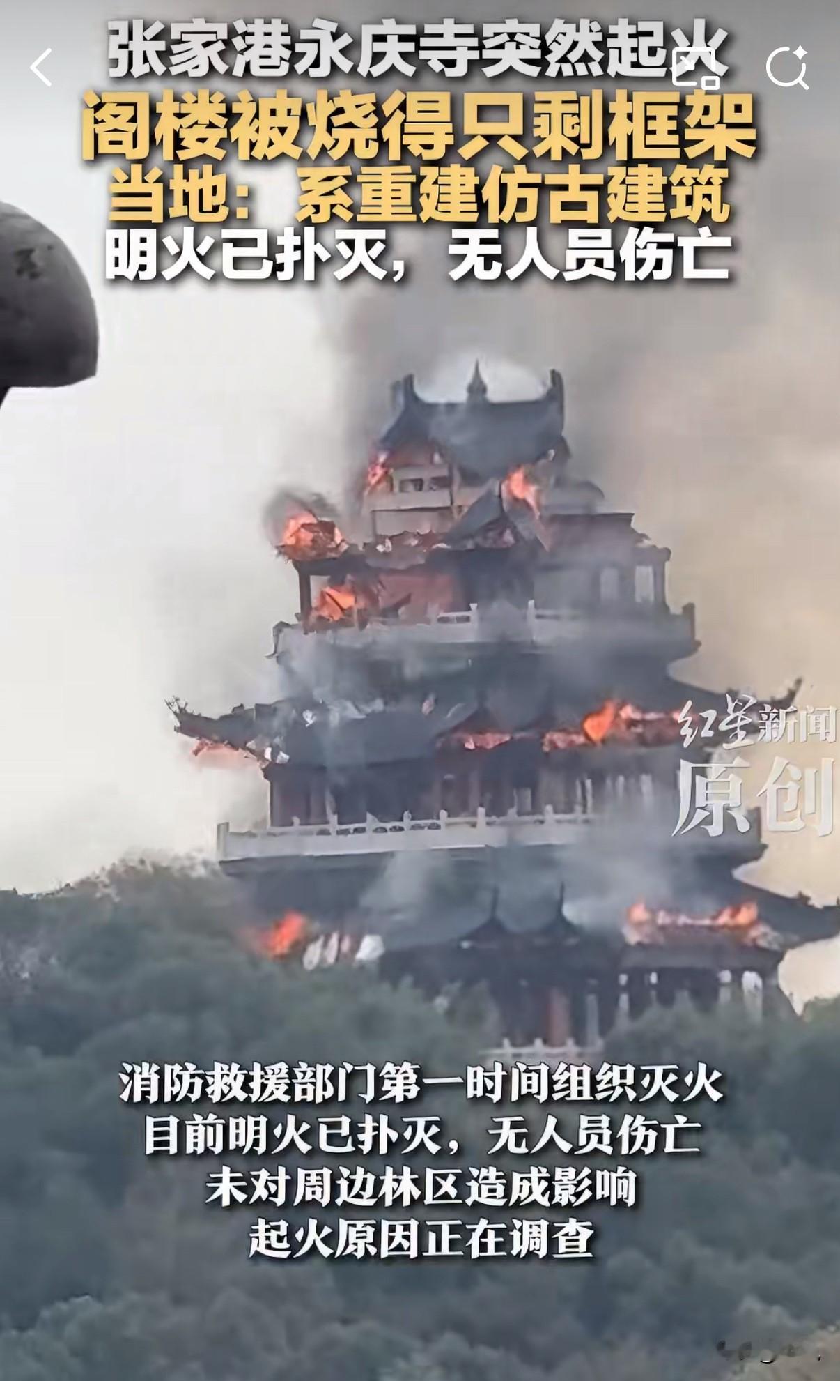还好佛祖保佑,无人员伤亡。 今天中午11点多,张家港凤凰山上的永庆寺突发火灾。从视频里能看到,那座三层高的文昌阁完全被大火吞没,黑烟滚滚,时不时有瓦片从屋顶掉落。 消防员赶到后迅速把火扑灭了。寺庙工作人员说,起火时他们正准备吃午饭,突然发现阁楼着火,现在寺庙已经暂时关闭。 这座寺庙可不简单,它有1500多年历史了,始建于南朝梁武帝时期,是著名的“南朝四百八十寺”之一。历史上曾经占地86亩,规模相当宏大。 不过这次烧毁的文昌阁是1993年重建的仿古建筑,不是原始古建。寺里真正的宝贝——唐代的罗汉像和罗汉堂都完好无损,这让人松了口气。 看着那座被烧得只剩空架子的阁楼,真是可惜。虽然主体是水泥结构,但内部的木制构件都烧光了。 为什么古建筑这么容易着火?有位文物专家曾说过,很多古建筑火灾都发生在修缮期间。有时候是电线老化,有时候是施工不当。 这座千年古寺经历过六次大修缮,没想到重建后才三十多年又遭遇火灾。 好在没有人受伤,周边山林也保住了。希望尽快查清起火原因,让这样的古建筑能得到更好保护。 每次看到这种新闻,都让人觉得历史文化遗产太脆弱了。你们觉得呢?