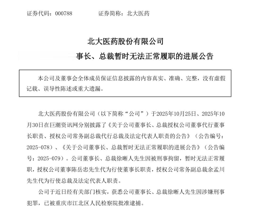 2025年11月12日,北大医药(000788.SZ)发布公告称,公司董事长、总裁徐晰人因涉嫌刑事犯罪,已被重庆市江北区人民检察院批准逮捕。