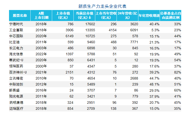 数据显示,符合新质生产力特征且市值超500亿的各行业前五大公司,共50家企业,合计市值近20万亿,包括宁德时代、工业富联、中芯国际、比亚迪、长江电力、海光信息、寒武纪-U、恒瑞医药等个股。