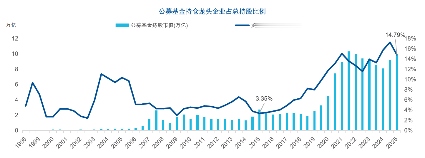 数据显示,截至今年9月底,公募基金占前述龙头企业自由流通市值比达到31.28%,较2015年的11.97%增加了近20个百分点。