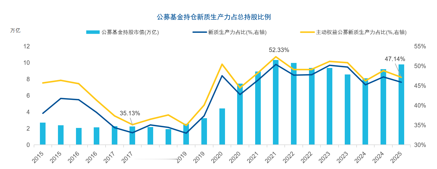 其中,主动权益基金持有新质生产力的市值占比也在近十年出现相似的上升趋势,至目前达到47.14%。