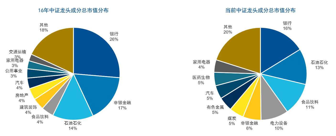 到了2025年,金融和石化行业在中证龙头指数中的权重则出现显著下降。数据显示,银行的权重占比回落至16%,石油石化行业也同步回落至13%,非银金融行业的权重则更加显著,至6%。