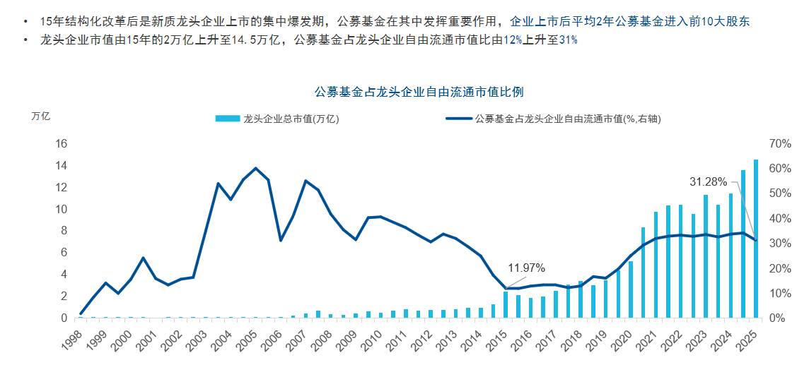 在2015年,供给侧结构性改革提出后,市场迎来新质龙头企业上市的集中爆发期,截至目前,龙头企业市值由2015年的2万亿上升至14.5万亿,企业上市后平均2年公募基金进入前十大股东。