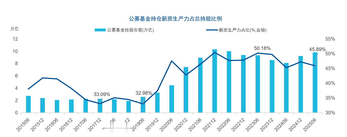 到了今年6月底,公募的持股总市值约是6.03万亿元,其中,新质生产力行业的持股市值占比达到45.89%。而在2023年6月底,公募基金持有新质生产力行业个股的总市值占比曾高达50.18%。