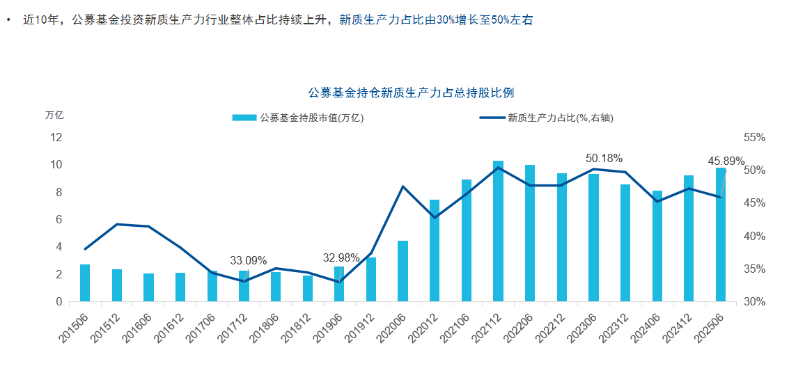 在行业层面,公募基金也呈现加大对新质生产力行业投资力度的情况。近10年,公募基金投资新质生产力行业整体占比正持续上升,在2017年底,公募基金总持股市值中,新质生产力相关行业的持股市值占比仅为33.09%。