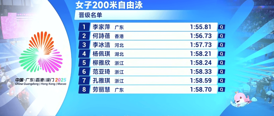 全运会女子200自半决赛:李家萍第一,何诗蓓李冰洁分列二三
