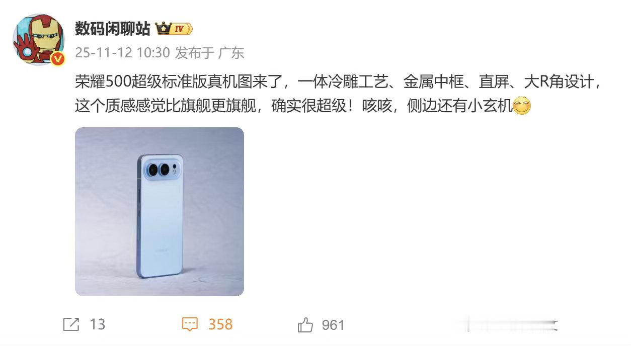 荣耀500真机外观亮相,全系列采用6.55英寸机身,荣耀500标准版搭载骁龙8sGen4处理器,荣耀500 Pro可能直接搭载骁龙8至尊版处理器,性能全面越级。荣耀500采用:8000mAh电池容量+80w有线充电荣耀500Pro采用:8000mAh电池容量+80W有线充电+50W无线充电骁龙8至尊 系列携手荣耀数字手机全球代言人肖战 全新大动作来袭!昨天荣耀首发破框而出live特效,今天绿厂也首发了出圈实况拼图。现在各家的首发功能已经抢得这么细了吗,你觉得谁是真首发?