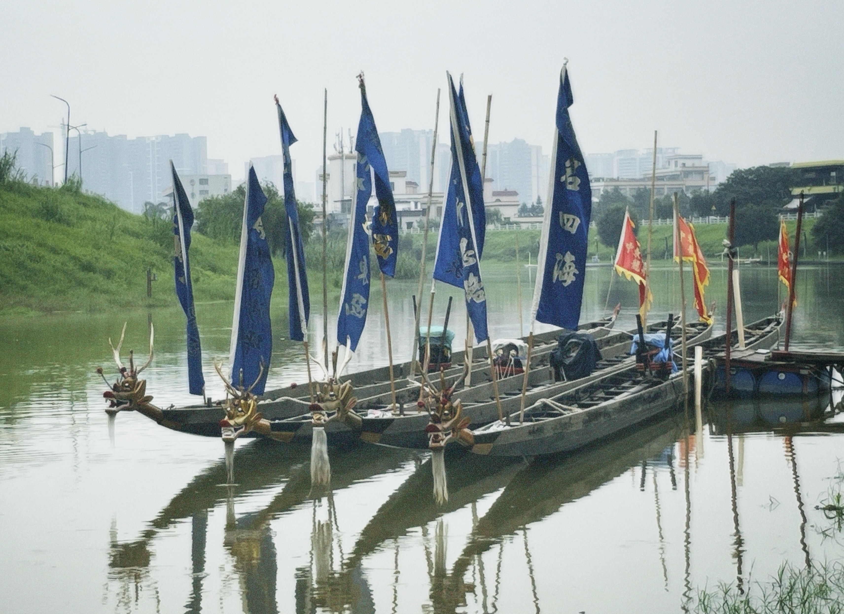 停靠在江边的龙舟