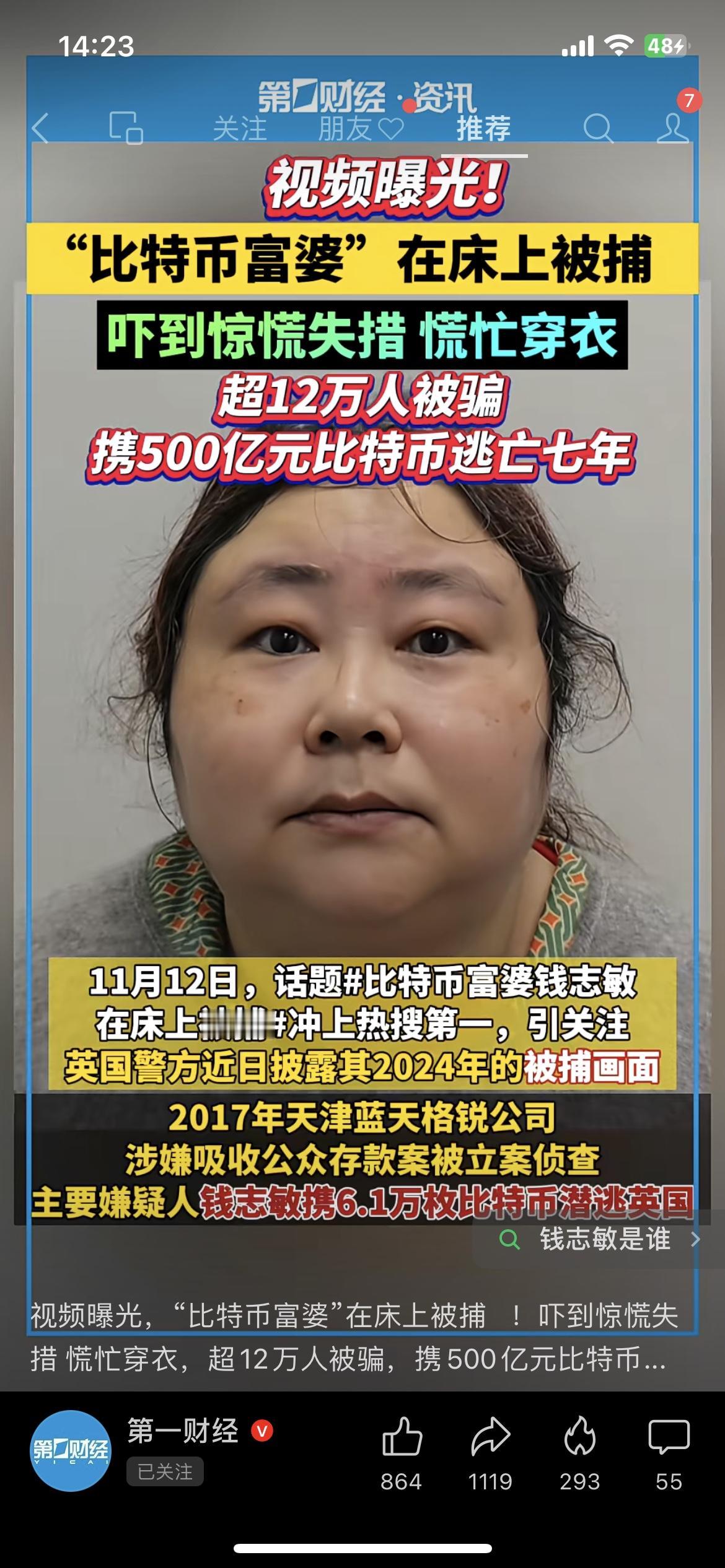 卷500亿比特币逃7年,这女的在床上被抓时,慌得衣服都穿反了! 藏了7年的“比特币富婆”钱志敏,终于栽了!英国警方曝的画面里,她在床上被抓时魂都吓飞了,衣服都穿反了…2017年她卷了天津蓝天格锐12万人的血汗钱,带着6.1万枚比特币(现在值500亿)逃到英国,躲了整整7年!这下被抓,总算是给受害者出了口气!只能说“出来混,早晚要还”——骗来的钱,就算藏到国外,也逃不过法律!你觉得这钱能追回来还给受害者不? 比特币富婆床上被捕 卷500亿逃7年终落网比特币陷阱 比特币洗钱大案