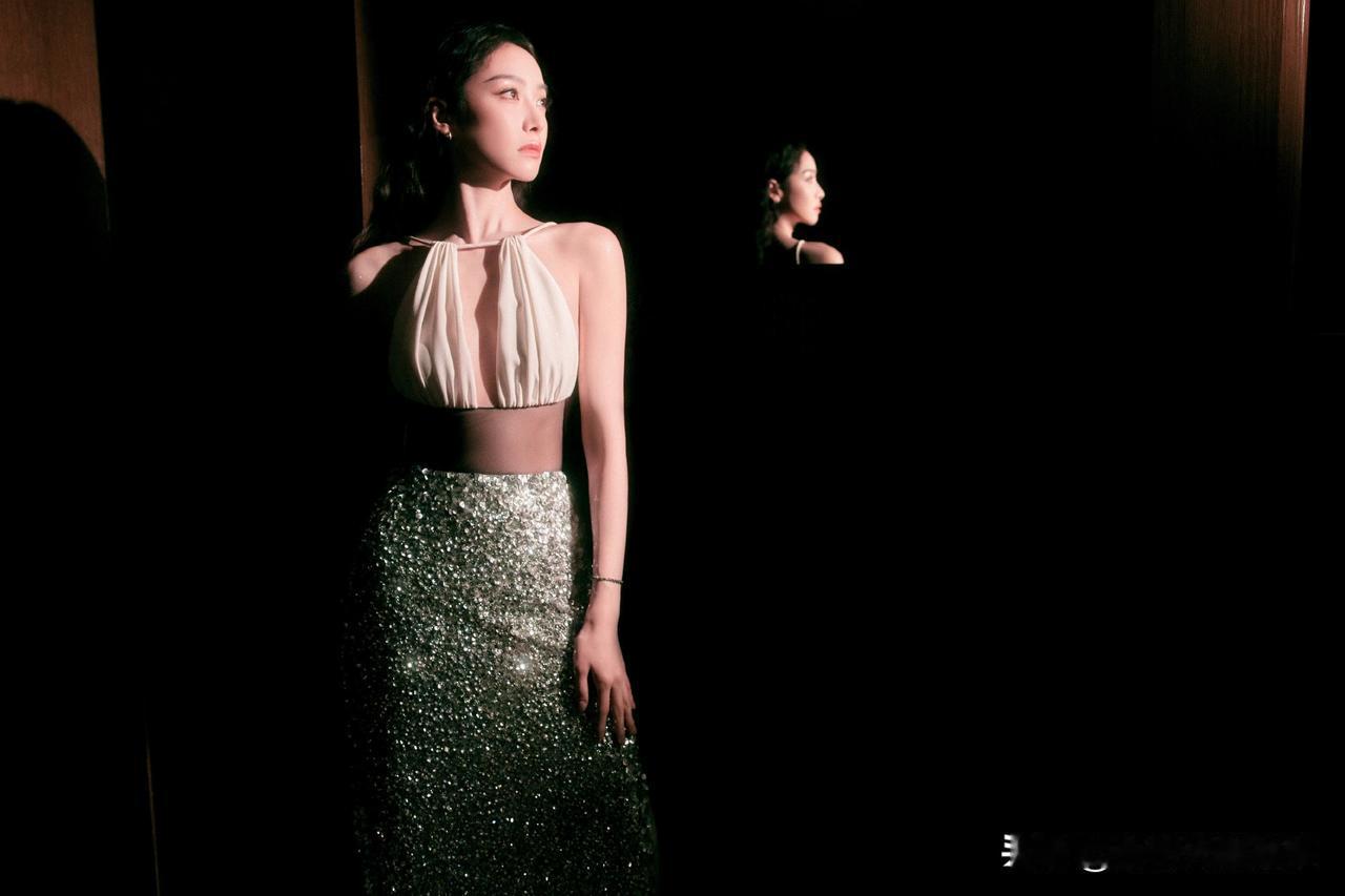 《银裙与玉背》 光缠上她的肩背,像揉碎的月落进银裙的闪片里。那线条是细雕的玉,连