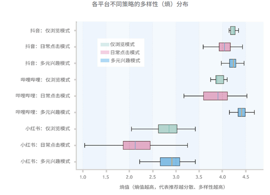 今天看了深圳大学发布的《短视频用户的算法实践与“破茧”报告》。给出了一个颠覆直觉的答案:👉 77.8%的用户认为算法推荐“出乎意料但有趣”,👉 73.9%的人通过算法发现了“以前不了解的新领域”,👉 75%以上的用户相信自己能主动影响推荐结果。换句话说,用户不是被动“被算法喂内容”,而是在主动“训练算法”。 算法不是“造茧”,而是基于兴趣推荐未知内容,拓宽视野。关于“信息茧房”的担忧被夸大了。研究团队发放了1200多份问卷,让用户给国内主流平台的算法打分,评估其算法的多样性、新鲜性、精准性和可控性。我理解算法只是影响用户感知的一方面,像是内容多样性、新鲜性和平台本身的内容供给丰富度也有关。【图1】此外,研究团队还做了代理实验,用“空白手机账号”模拟三种用户行为模式(仅浏览、日常点击、搜索探索),熵值越高,代表推荐性越强,见【图2】。这个实验发现,无论在哪种模式下,抖音的推荐多样性都处于高位,印证了大家说的“抖音算法强”;哔哩哔哩的推荐多样性则高度由用户行为驱动;小红书则以高效收敛、精准聚焦为主要特征。这个研究很有意思,此前没见过对具体平台的算法测评,信息量很大。1️⃣ 抖音:多样性整体最高,且对用户行为最“敏感”• 无论是“仅浏览”、“日常点击”还是“多元兴趣”,抖音的熵值都处于高位(约4.0以上)。• 说明抖音算法既能精准匹配兴趣,又保持探索性。当用户表现出多元兴趣时,多样性不降反升,说明系统会积极“响应探索”——算法具有自适应拓展机制。👉这意味着抖音算法能积极满足用户“破茧”需求,平台在鼓励探索上也更主动。2️⃣ 哔哩哔哩:用户主导型多样性,波动大但潜力强• B站在“仅浏览”时熵值较低,但在“多元兴趣模式”下跃升至最高(4.4左右)。• 这说明B站算法的多样性高度依赖用户主动行为,而非算法自身的“探索性”设计。👉换句话说,B站用户的能动性决定了信息多样性,这与B站年轻用户群体的主动探索习惯、高内容自定义度高度吻合。3️⃣ 小红书:算法高效收敛,聚焦而非拓展• 在三个平台中熵值最低,且从“仅浏览”到“日常点击”显著下降(约2.8 → 2.1)。• 即算法在捕捉兴趣信号后,会迅速聚焦、强化垂直内容。👉说明小红书的推荐逻辑更偏向兴趣深耕与社群聚合,这不意味着用户被困在“茧房”里,而是说明平台更强化垂直沉浸体验。延展来看,这份报告是在回答中国网民如何理解算法和“茧房”关系的问题:首先发现,“茧房”可能被高估了,绝大多数用户认为算法推得挺丰富;其次,用户应对算法的自主性很强,善用搜索、“不感兴趣”等功能告诉算法自己想看什么;最后,各平台算法各有侧重,有更平衡稳定的,有更精准敏捷的,看你需要哪个就看哪个,当然最好还是各种渠道都看一下,丰富摄入。不过退一万步讲,假如你都不想看,懒得上网,只想待在自己的“信息舒适区”里有问题吗?其实也没啥,你开心就好。我觉得就算有“茧房”,这事也没多严重,有你自己的一方天地。人生匆匆三万天,开心度过每一天最重要。