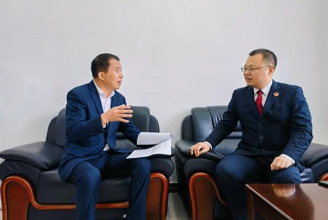 胡为义代表(左)与荆门市东宝区检察院党组书记、检察长肖必辉交流时,对检察工作表示肯定,并希望检察机关“加大公益诉讼力度,守护好绿水青山”。