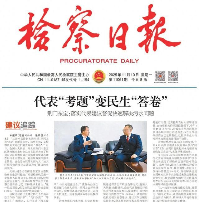 “从污水直排到水清岸绿,从网上被‘点名’到群众点赞,这些变化,是检察机关交给我们最直观的‘答卷’。”近日,全国人大代表、湖北省荆门市东宝区牌楼镇来龙村党总支书记胡为义了解到东宝区检察院通过网络线索快速办理农村污水治理案后,对该院务实举措表示赞赏。这也是该院落实胡为义“加大环境污染治理公益诉讼力度”建议的生动实践。
