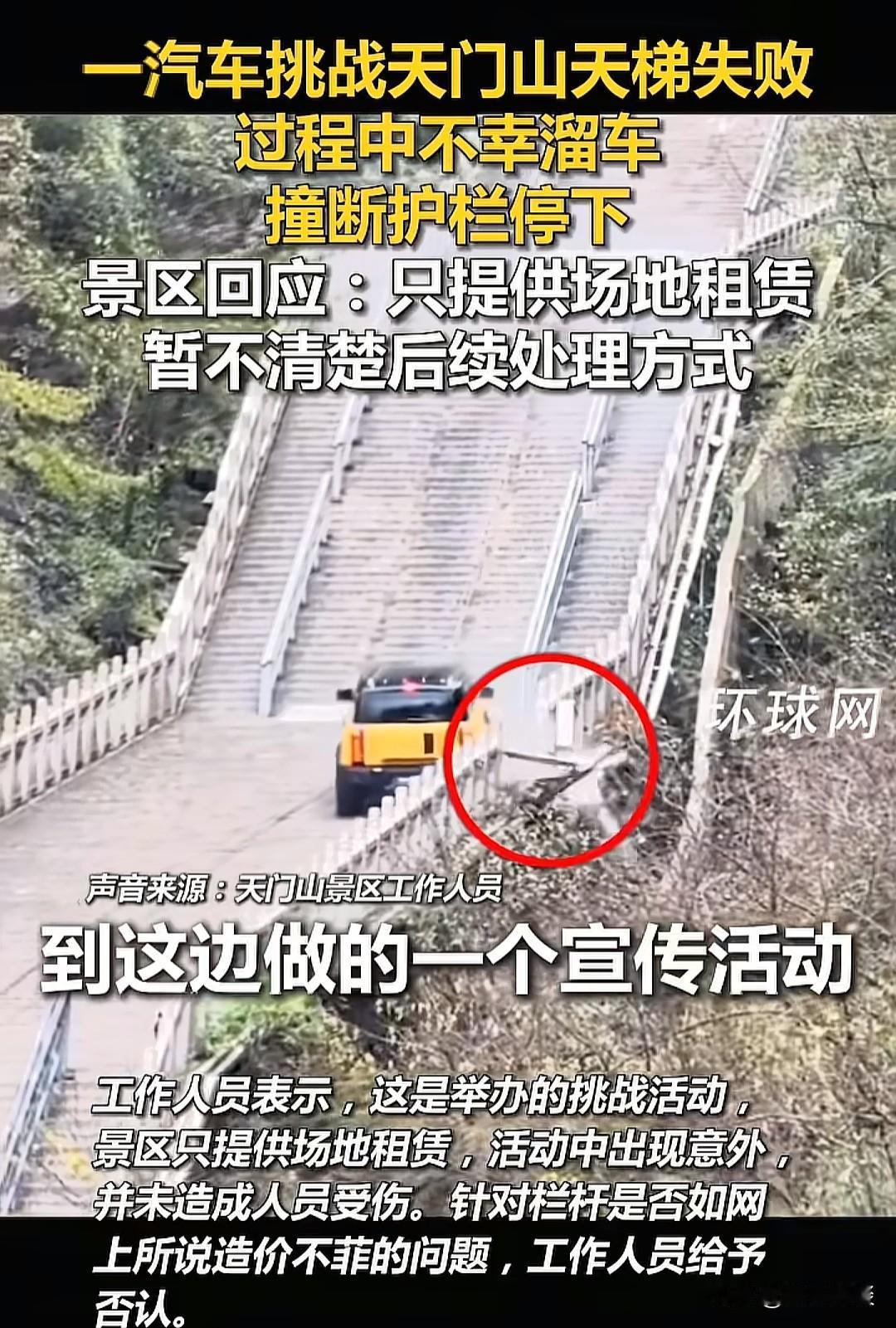 某车企可能是受到路虎的启发,开车挑战天门山999级台阶。 没想到一场浩浩荡荡的宣传活动却发生了意外。不知是因为驾驶技术的原因还是车辆异常导致,车爬上台阶的过程中突然溜车。 幸运的是车只是把护栏撞断后及时停了下来,要不后果不堪设想,毕竟护栏隔着万丈深渊。 对于此事,景区表示只提供了场地,而且护栏造价没有网友说的那么离谱,至于是否容许举办此类活动,大家看曾经路虎的宣传就应该知道答案