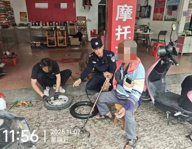 近日,市公安局云安分局都杨派出所民警在巡防工作中,发现一名老人在路边不停东张西望、神色焦急,旁边还停着一辆三轮车。巡逻民警立即上前询问情况。经询问得知,该老人驾驶三轮车行至该路段时车胎爆胎,因身体行动不便且身上没带现金,在路上不知所措。巡逻民警了解情况后,迅速将老人的三轮车推至附近维修点,并主动自掏腰包帮其更换新轮胎。