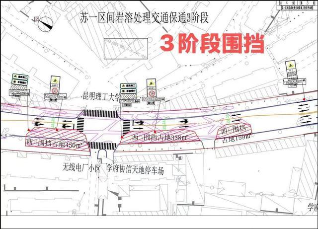 苏一区间岩溶处理施工交通疏解第一期围挡分四阶段实施,一阶段围挡建设路西侧小里程段(临近学府路),二阶段围挡东侧小里程段,三阶段围挡西侧大里程段(临近一二一大街),四阶段围挡东侧大里程段(详见附图)。每阶段围挡期间,将保障建设路8米宽双向2条机动车道及非机动车道正常通行,同时在临近沿街商铺区域预留1.5米宽人行通道,满足行人通行需求。