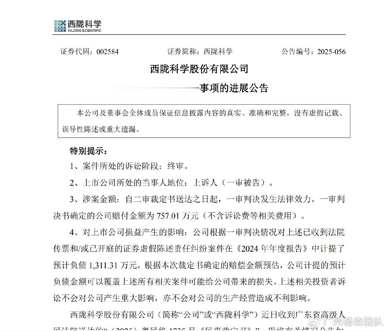 2025年11月11日,西陇科学披露《关于投资者诉讼事项的进展公告》,近日收到二审裁定,撤回上诉,一审判决生效。
