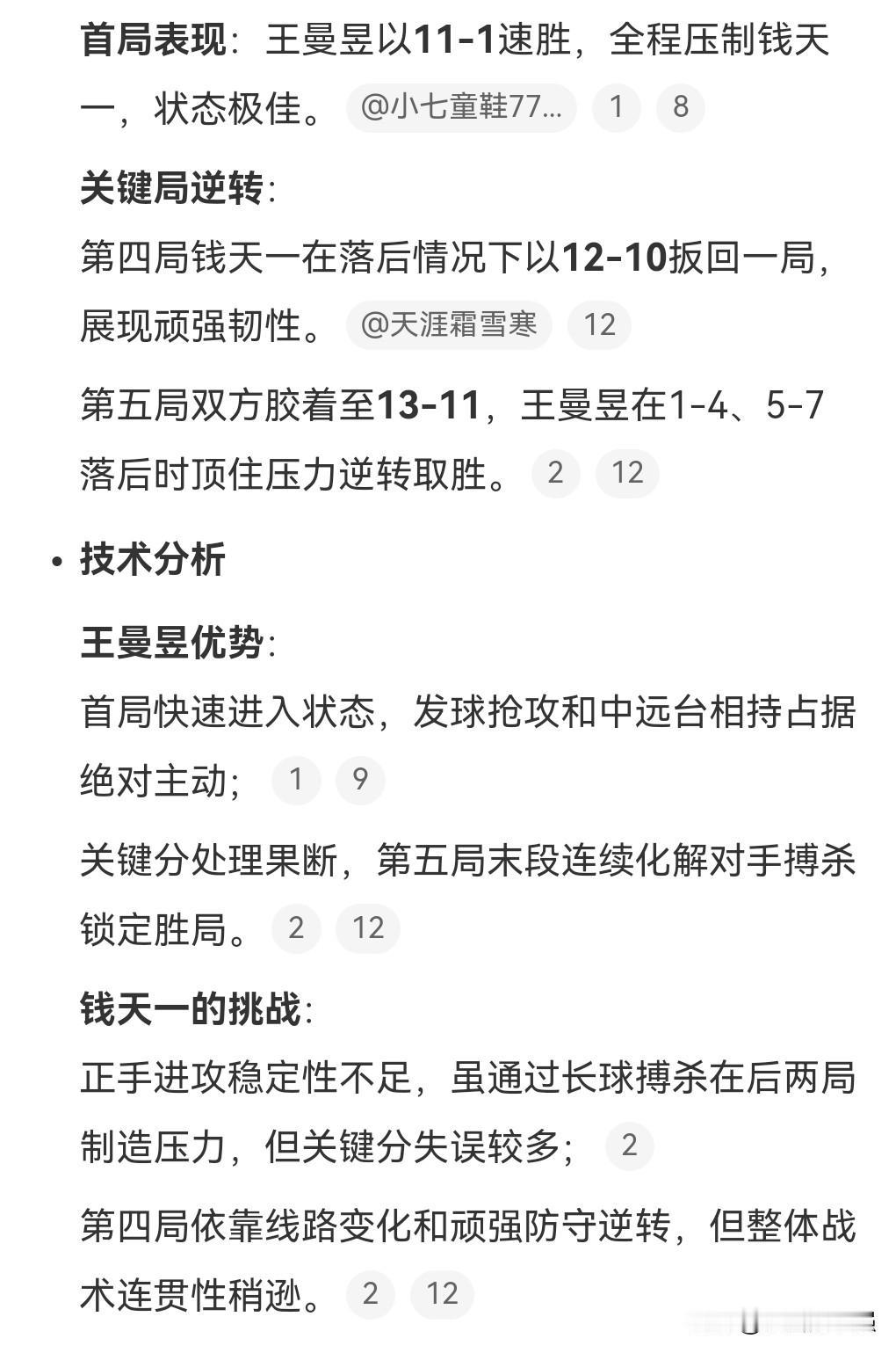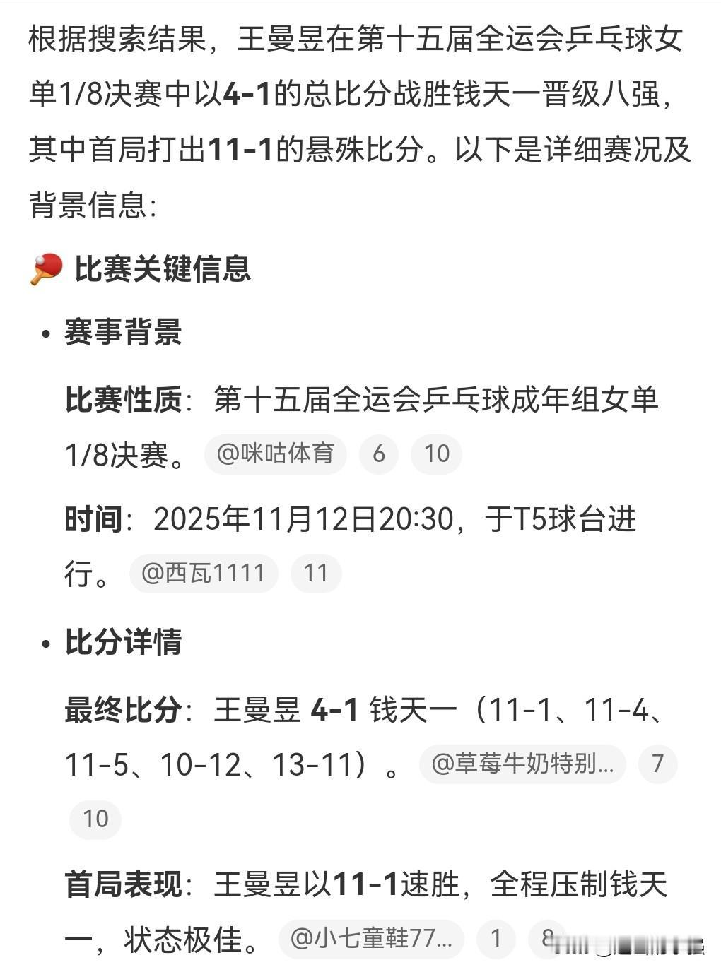王曼昱的状态好极了呀,11月12日,王曼昱对战钱天一。 第1局比赛,王曼昱11比1钱天一。 这实力也太炸裂了吧,竟然打了个11:1。 王曼昱最终4:1赢下了本场比赛。 接下来将对战王艺迪。 王曼昱的实力挺强的,职业生涯中最大的对手应该是孙颖莎了。