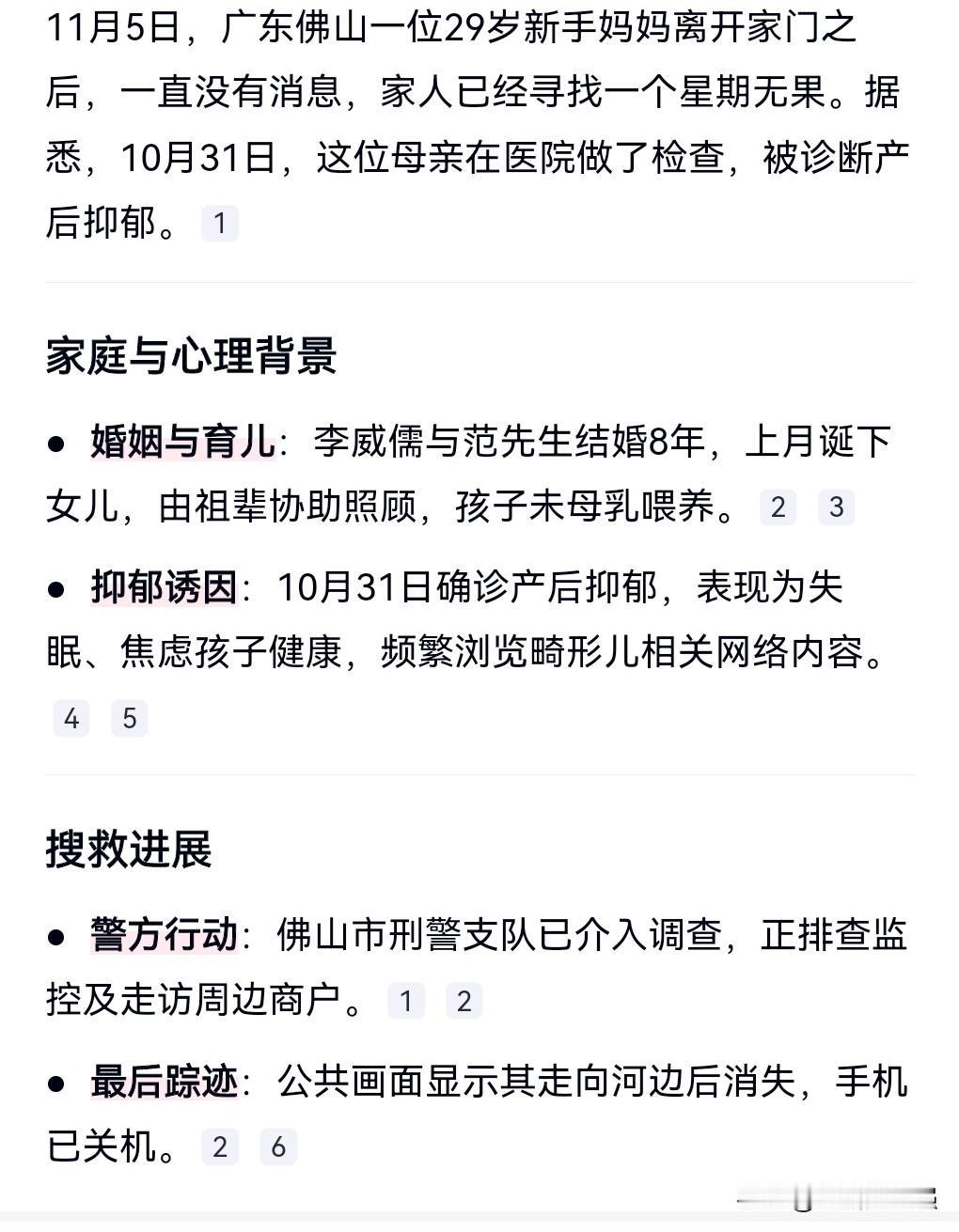 这真的是太让人担心了。 11月12日报道,29岁女子失踪一周,上月刚生完孩子。 女子患有产后抑郁症。 患抑郁症的人真是不少啊,想当年我都经历过几个月这样的困境,还好最后走出来了。 女子已经失踪一周了,这真是太让家人担心了,一定要早日找到,希望她平安。