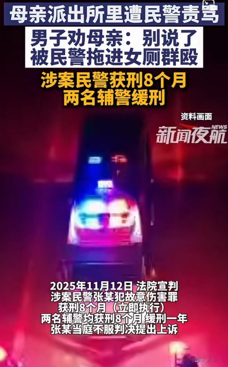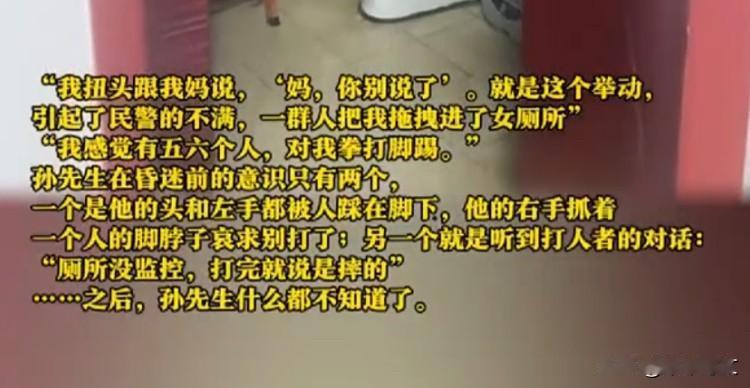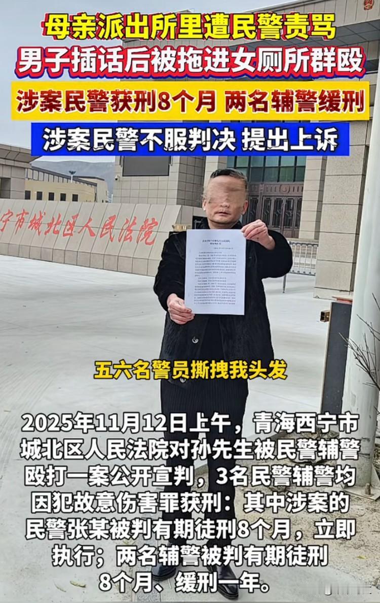 这下好了,令全国人民心寒了! 青海西宁,几位民警将一名男子拖进女厕所群殴。甚至大言不惭地说:“厕所没监控,打完就说摔的!” 近日,青海西宁一则新闻冲上热搜。 事情发生在2022年8月29日,当天,孙先生带着母亲一起下楼做核酸。 因之前没按时做核酸,导致这次扫码时显示异常,被赶来的民警带到青海省西宁市公安局彭家寨派出所。 当时安全码异常的有5个人,民警不停地责骂他们。 后面,孙先生的母亲跟民警解释没及时做核酸的原因。没想到民警开始不耐烦了,从一开始骂5人变成只骂孙先生母亲一人。 听到母亲被骂,孙先生心里虽然不舒服,但也只是让母亲别再说话了。就是这一举动,不知道怎么惹怒了几位民警。 他们把孙先生拖拽进了女厕所,据孙先生回忆:“我感觉有五六个人对我拳打脚踢。我的手和头被踩在脚下,我的右手抓着一个人的脚脖子哀求他们别打了。” “另外,我还听到打人者的对话,说厕所没监控,打完就说是摔的!” 之后,孙先生就陷入了昏迷,什么都不知道了。 青海大学附属医院的急诊病例显示,孙先生初步被诊断为右侧多发肋骨骨折,头部外伤,以及多发软组织挫伤,左侧眶内侧壁凹陷。 孙先生住院期间,彭家寨派出所的前任及现任领导多次上门,希望能跟孙先生私了此事。 2022年9月6日,孙先生签了和解协议,还接受了对方10万元的赔偿,以及免除他3个月养伤期等铺面租金的补偿。 领导们将和解协议带走后,一直到2023年的5月份,孙先生也没等来处理结果。 5月22日,孙先生前往彭家寨派出所询问情况。 没想到竟然看到打人者张某还在派出所正常上班。孙先生上前询问情况,结果张某竟然对打人一事矢口否认。 孙先生对此十分愤怒,随后向西宁市公安局城西分局举报,向督察举报,向纪监部门举报,并先后做了三次司法鉴定,均鉴定为轻伤害。 历经三年,期间法院开了两次庭,孙先生终于等到了判决结果。涉案民警获刑8个月,两名辅警缓刑。涉案民警张某不服判决,还提出上诉。 据孙先生透露,在过去的几年时间里,他走不出如梦魇般的遭遇,一闭眼就是被群殴时的场景,痛苦至极! 执法者知法犯法沦为施暴者,努力了三年才换来了8个月的刑期,这是否正义?知法犯法不应该重罚吗? 8个月的刑期,难以衡量孙先生这三年间的身心创伤。这能抚平受害者的伤痕吗?