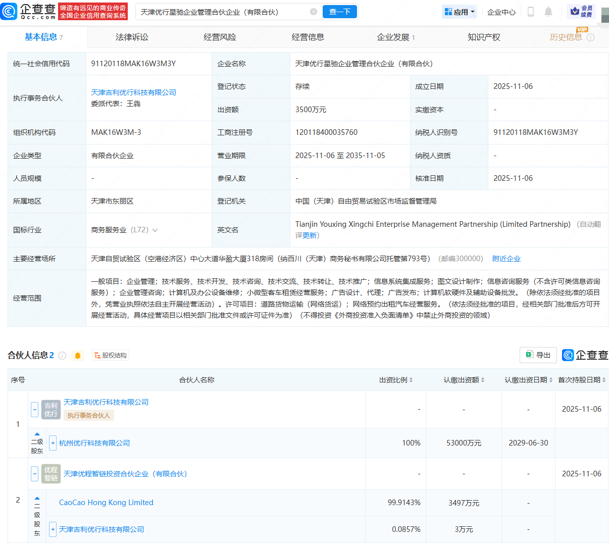 企查查APP显示,近日,天津优行星驰企业管理合伙企业(有限合伙)成立,出资额3500万元,经营范围包含:企业管理、信息系统集成服务、小微型客车租赁经营服务等。企查查股权穿透显示,该合伙企业由曹操出行旗下天津吉利优行科技有限公司、天津优程智链投资合伙企业(有限合伙)共同出资。
