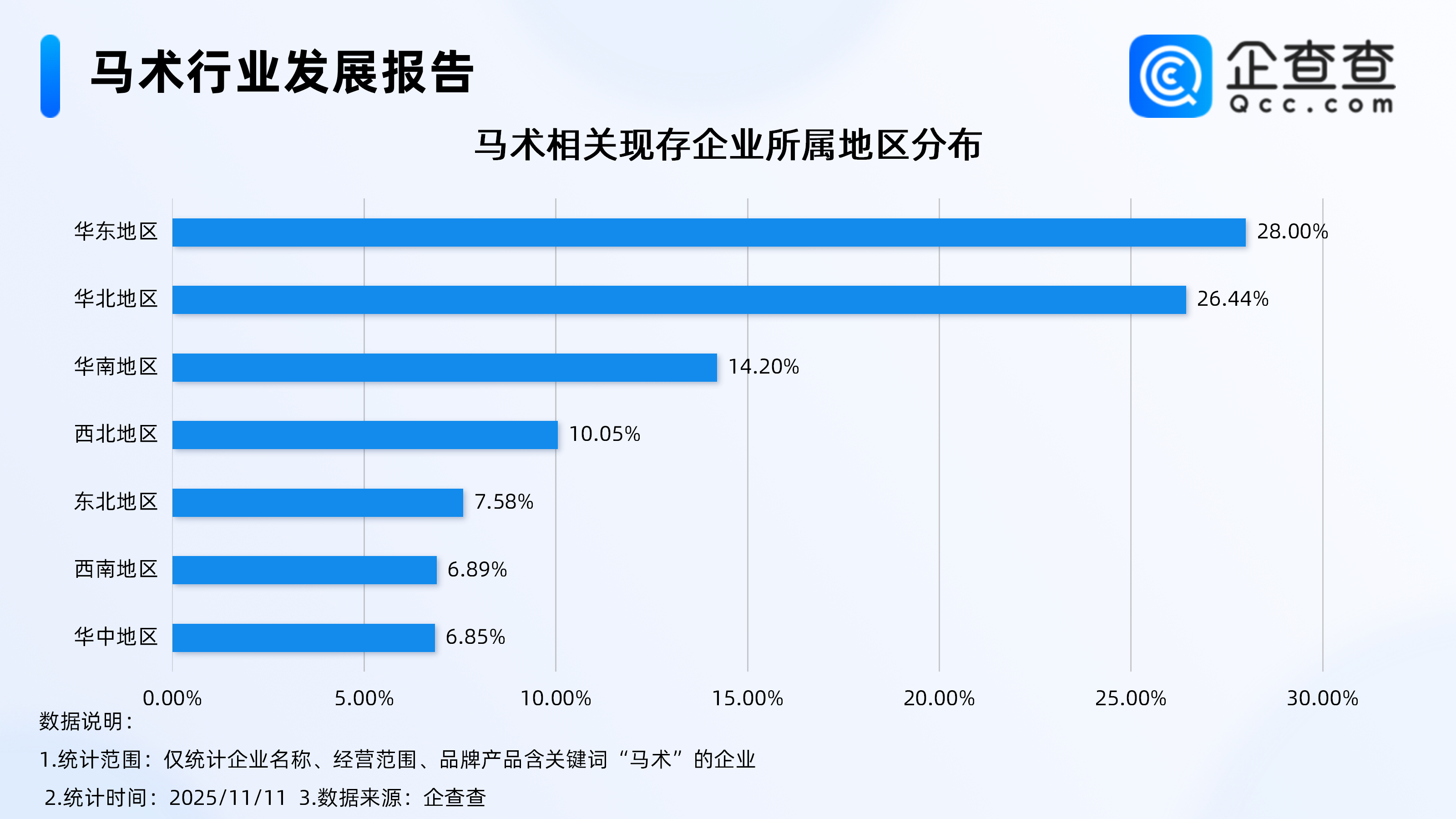 企查查数据显示,截至11月11日,国内马术相关企业现存量达4747家,其中马术俱乐部相关企业达2216家。从地区分布来看,马术相关企业多分布在华东、华北地区,分别占比28%、26.44%。分布在华南、西北地区的相关企业,分别占比14.2%、10.05%。