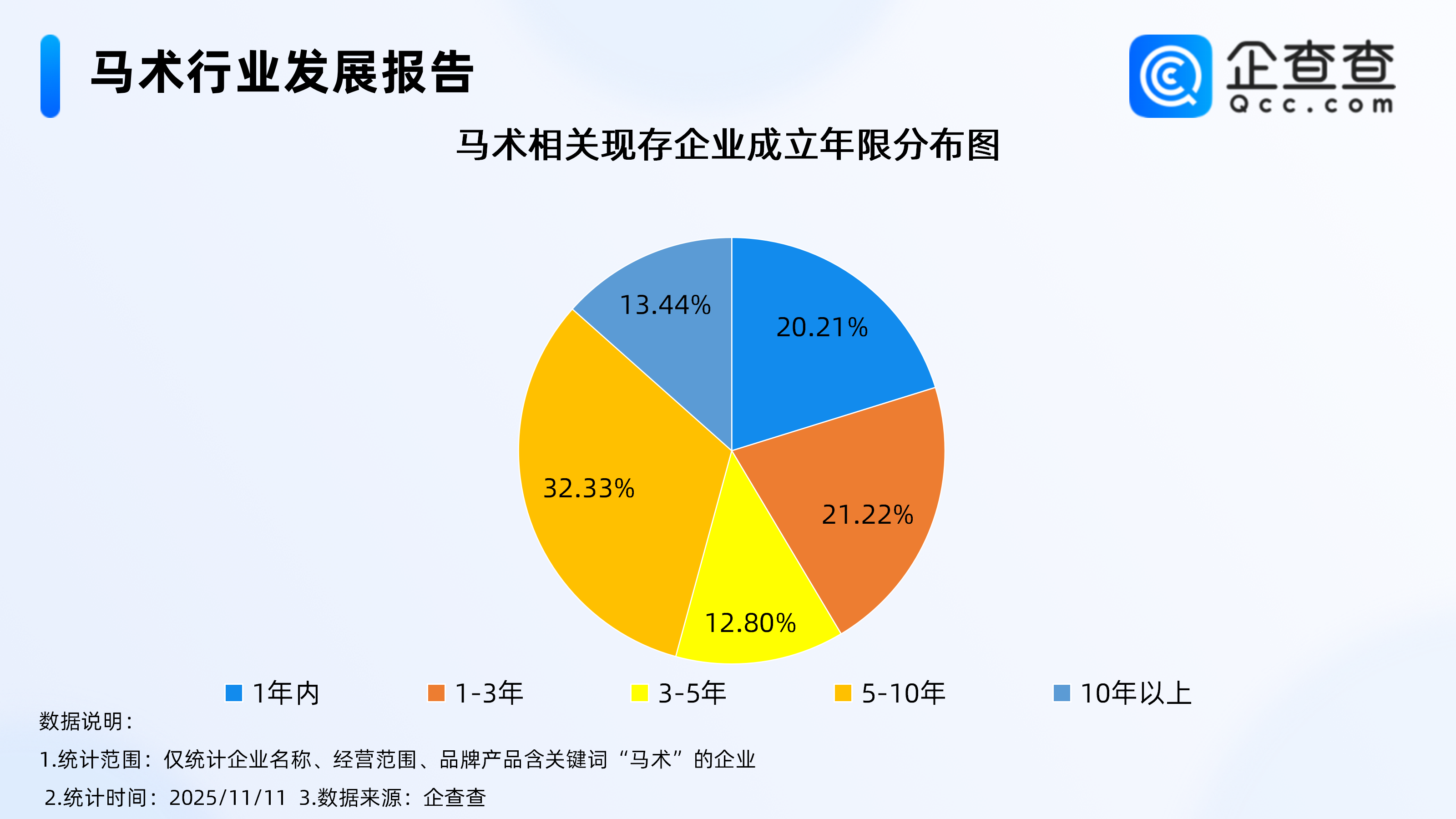 企查查数据显示,从成立年限来看,国内马术相关现存企业中,超三成相关企业成立年限在5-10年,占比达32.33%。其次为成立年限在1-3年的相关企业,占比达21.22%。成立于1年内的相关企业与成立年限在1-3年的相关企业占比相近,达20.21%。