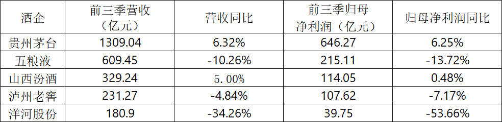 头部五大酒企(茅台、五粮液、汾酒、泸州老窖、洋河)前三季度营收合计2659.90亿元,同比降6.3%;净利润1122.80亿元,同比跌4.5%,分列见下: