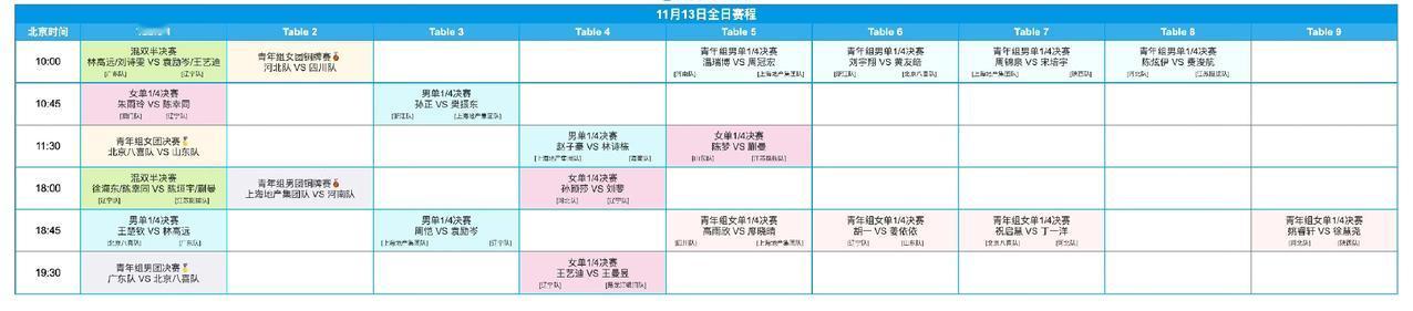 今日(11月13日,周四)赛程来喽! 2025年第十五届全运会乒乓球项目11月13日赛程 如图所示。 两场混双半决赛分别在上午十点和晚上六点开战,经典组合林高远/刘诗雯将要出战。 樊振东、陈梦、朱雨玲等国乒前主力选手都将在上午出场。 晚上黄金时段,王楚钦迎战林高远,王曼昱迎战王艺迪。 我来预测一下男单四强,男单四强会是王楚钦、樊振东、袁励岑、林诗栋! 你们说呢?[笑哭]