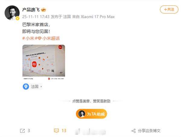 【】日前,小米法国副国家经理 在微博发文称,“巴黎米家首店,即将见面。”据了解,这家即将开业的小米之家为直营门店。针对网友提出的“之前不是在香街有一个吗?”的疑问,产品逸飞回应称:“之前是客户开的店,由于疫情暂时退出了。”据悉,2018年5月22日,小米正式宣布进入法国市场,在巴黎发布会上,小米宣布将把整套商业模式全部带到法国,包括小米网和第一家小米授权店。