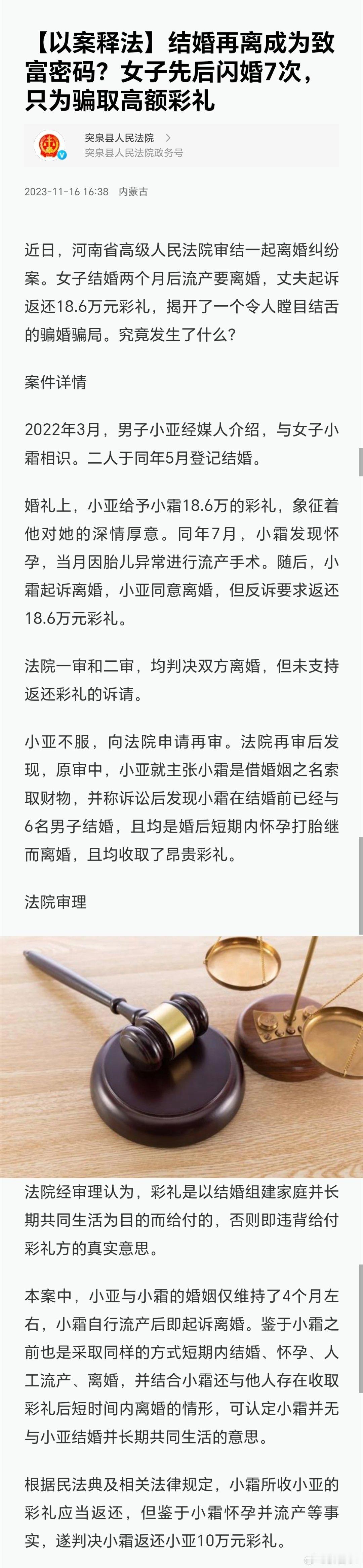闪婚的结果,大概率是闪离。智搜显示,男方是在今年5月与婚介公司签订合同,支付2万定金后赶往贵州,最终在见面后第2天即与女方订婚。给付彩礼等各项费用,合计42万。结果,仅2个月后,女方就以回家考驾照为由,闪现跑路。到底是不是骗婚,目前来看证据不足。因为,契合当前法律的骗婚行径,必须是有身份作假为前提,而像是身份正常,但确有骗取钱财的,一般都只会认为是男方倒霉。大家可以看下图2的案子。先后闪婚7次,连法院都觉得不对劲了。但是没办法,判不了诈骗,因为人家是“合法创业”,没有虚构身份,亦未有信息造假。哪怕就是奔着骗钱去的,18.6万彩礼,最后也只返还了10万。