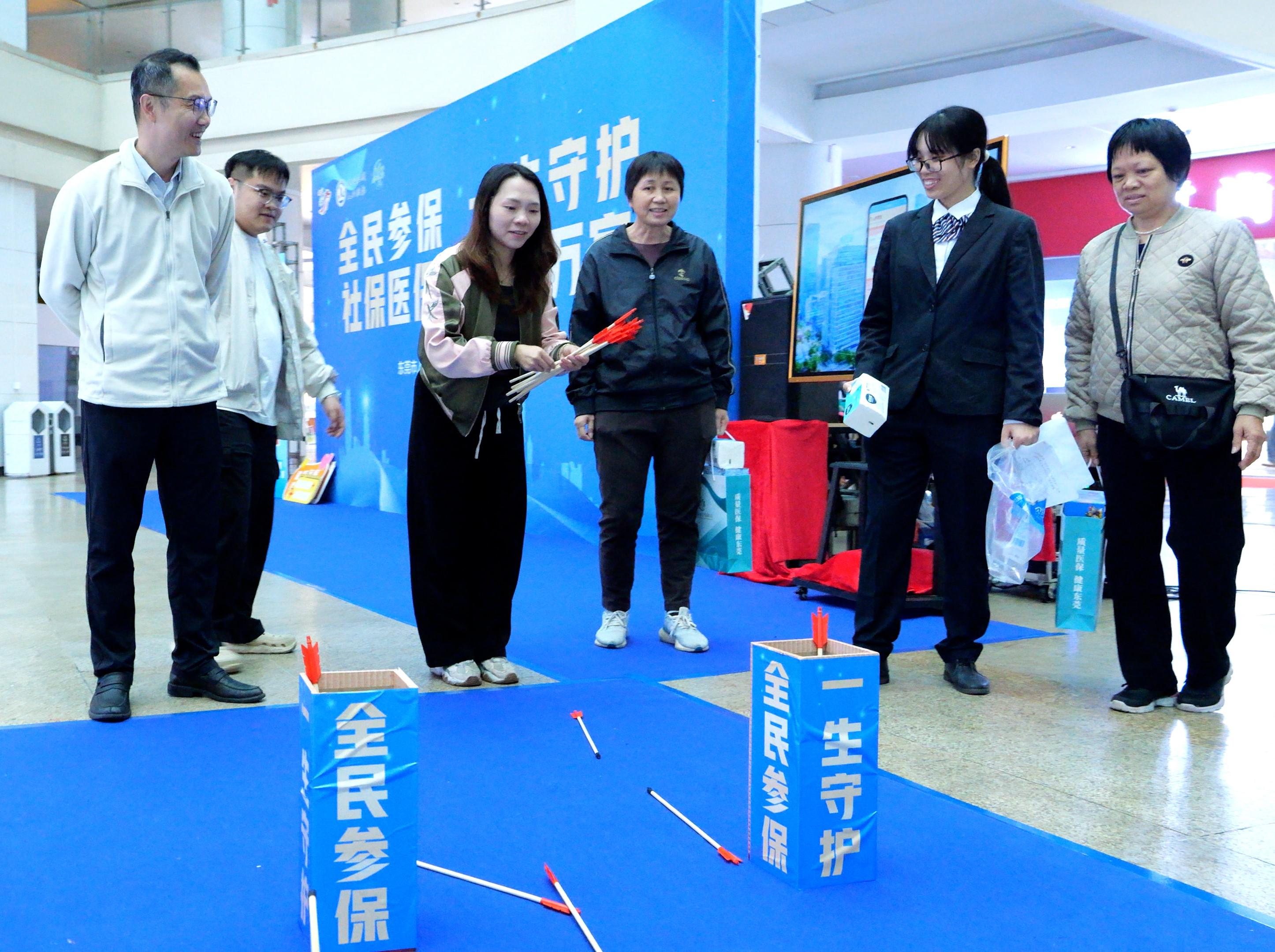 本次活动内容丰富。设置舞台区、咨询区、游戏区、打卡区。首先,短片视频环节介绍了全民参保的好处、“社银合作”打造15分钟便民服务圈、提醒不要上当受骗等等,干货满满。然后,主持人介绍现时医疗保险各项政策,并与现场人员互动,让政策更深入人心。最后,结合现场咨询、小游戏相结合的形式强化体验感。在咨询区域,我分局业务骨干围绕医保相关政策,现场为群众答疑解惑、发放宣传资料,进一步提高社会公众依法参保意识。游戏区域设置了投壶、脚印跳跳乐和人社医保问题大转盘等互动游戏,游戏胜出和答对题目的群众都可以获得一份小礼品。各社银合作银行围绕自己的服务特点,向前来群众介绍社银合作业务、个人养老金业务等政策。
