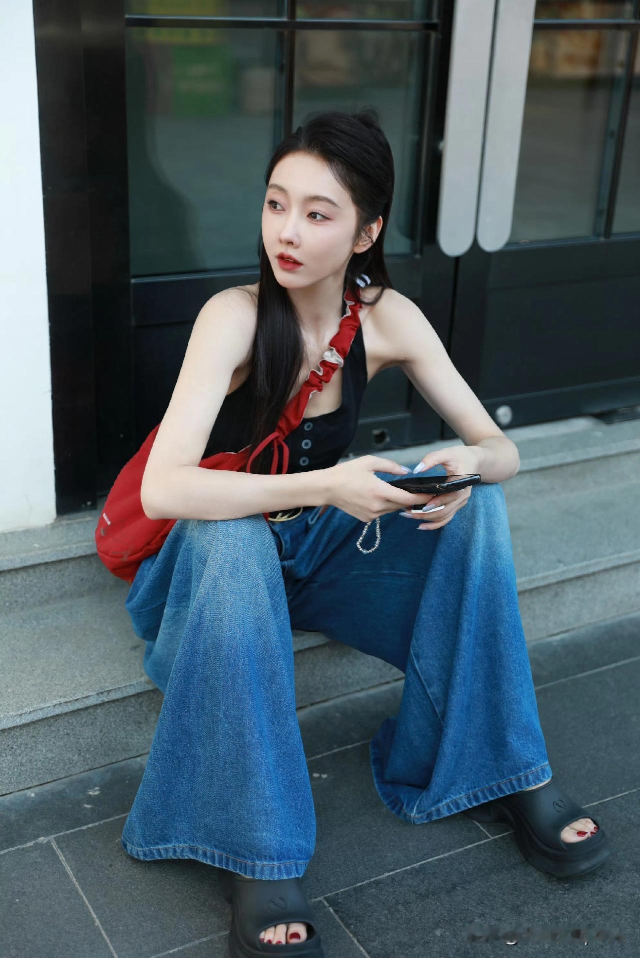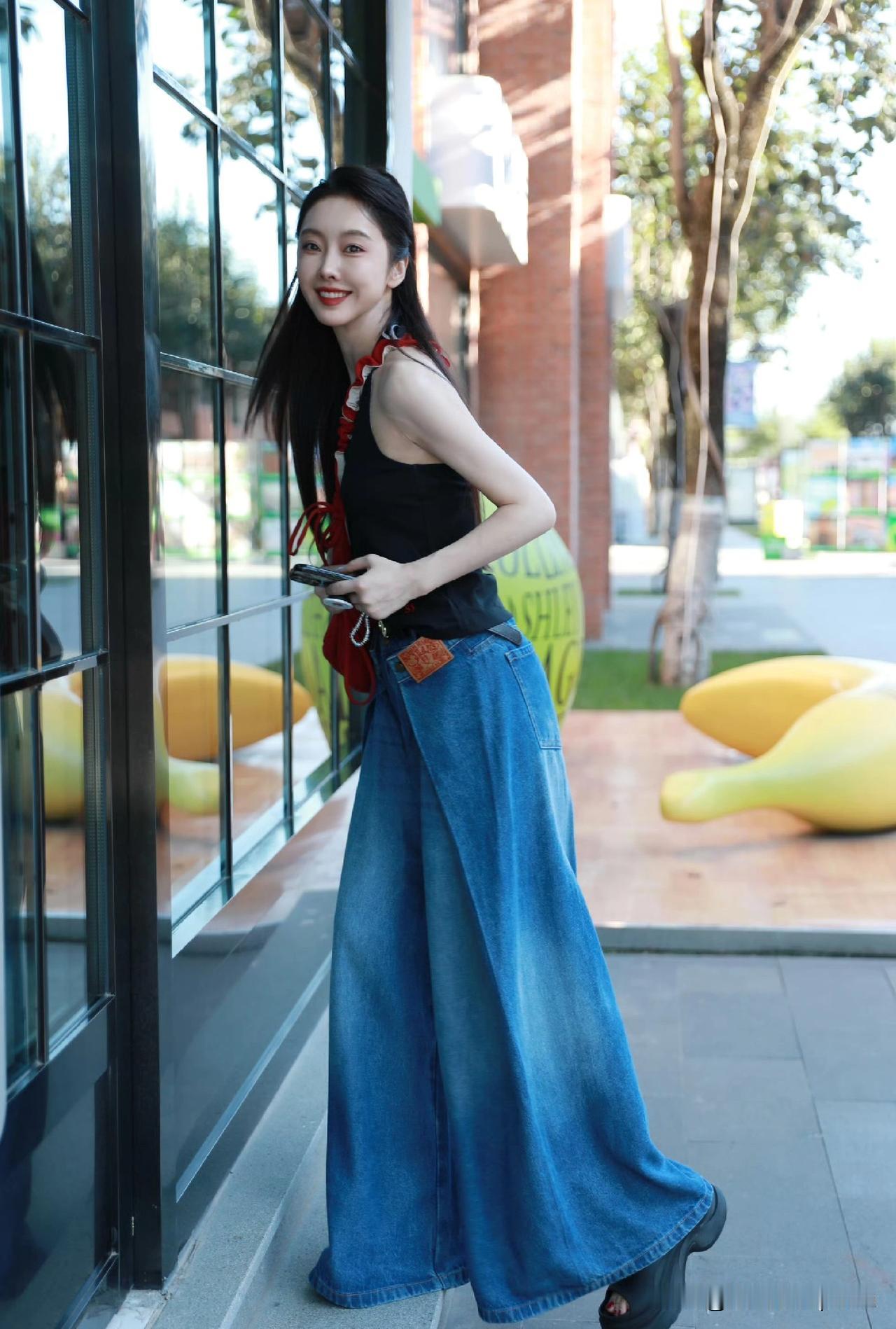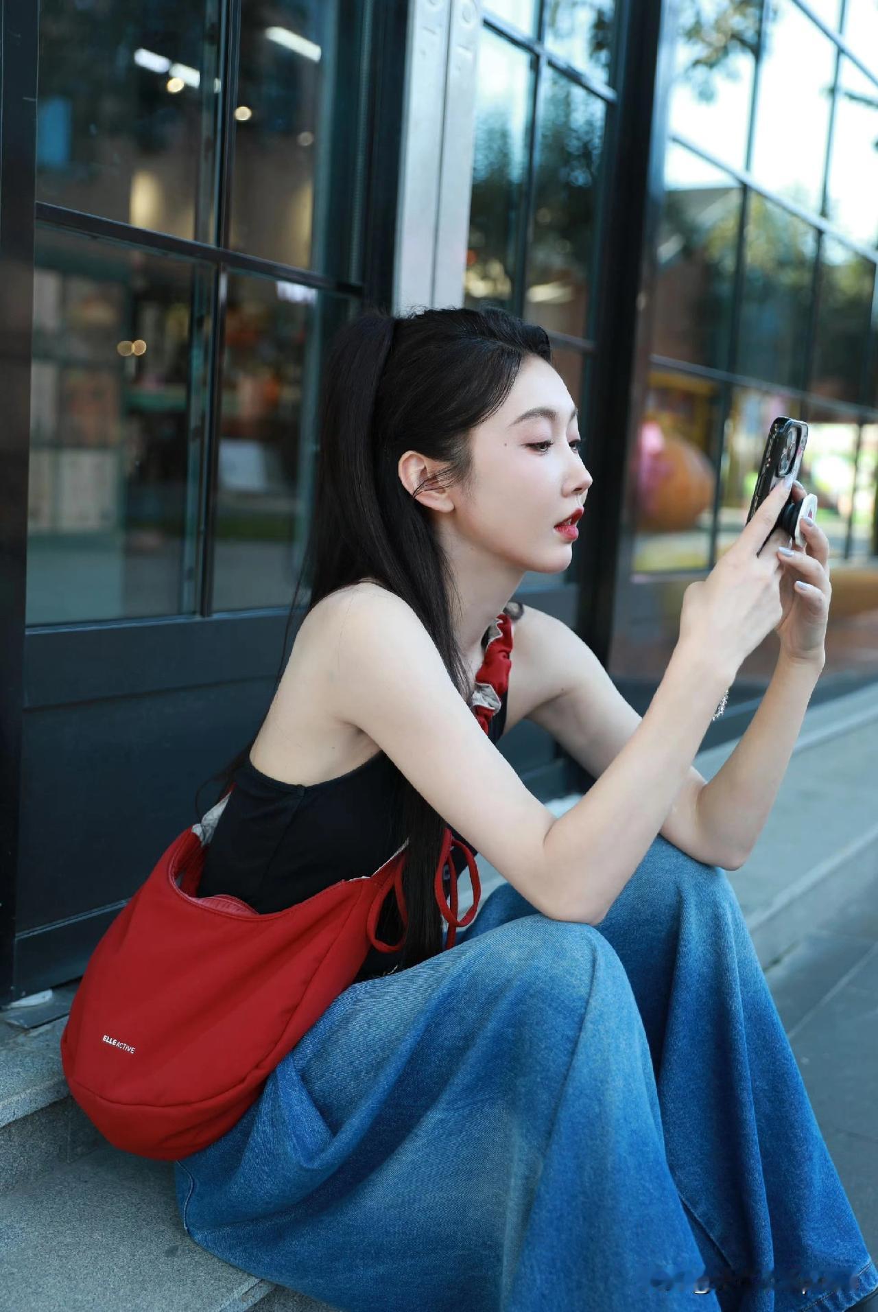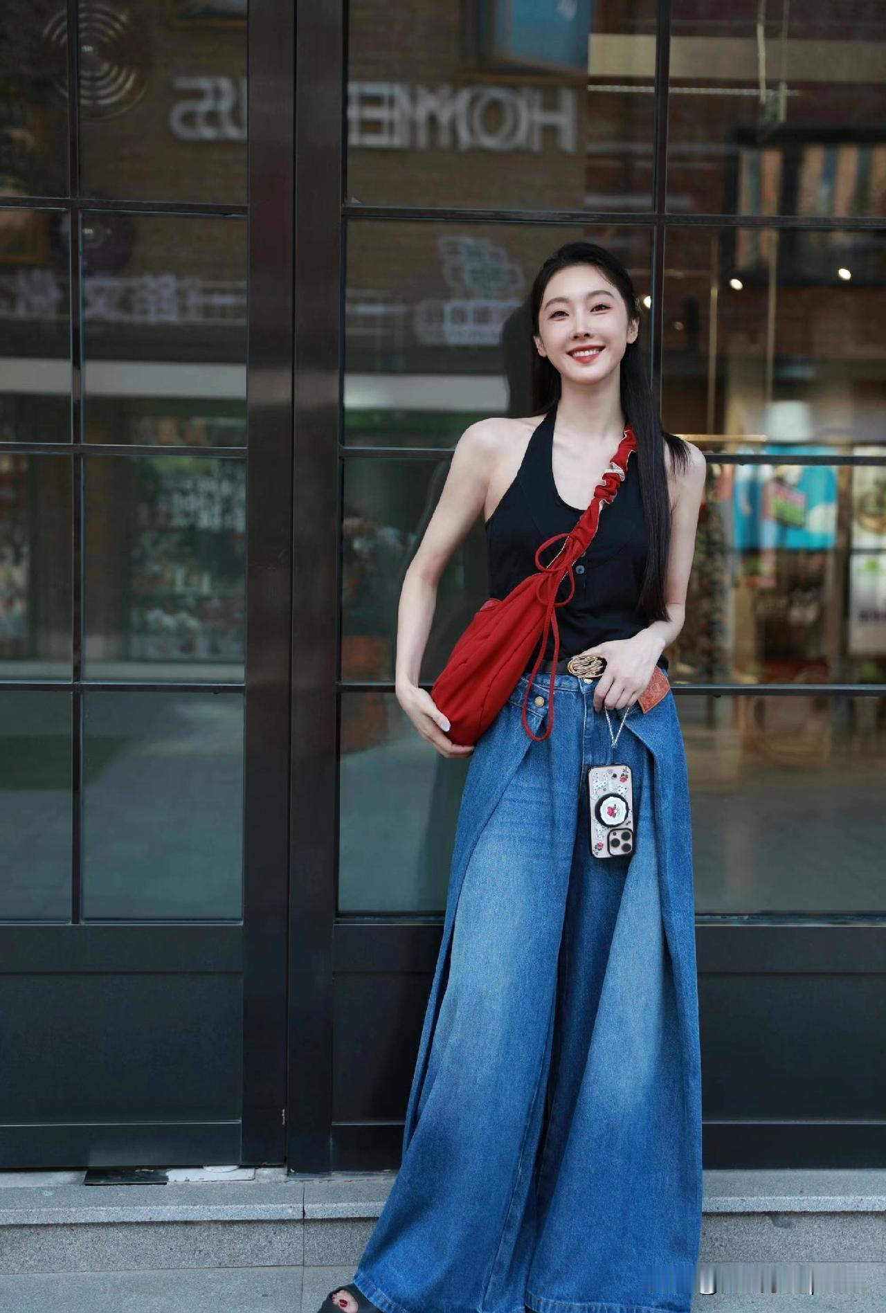 宣璐这身搭配也太让人眼前一亮了吧! 以前可能没太注意,但这一身简约造型把她的优势全放大了一—高挑身材驾驭这种上紧下松的搭配简直完美! 黑色背心利落显瘦,宽松牛仔裤随性又衬得腿更长,那个小红包更是点睛之笔,让整体不会太素。 半扎发和干净妆容更突出了她清秀的五官。 这种不费力的时髦感,才是最高级的!