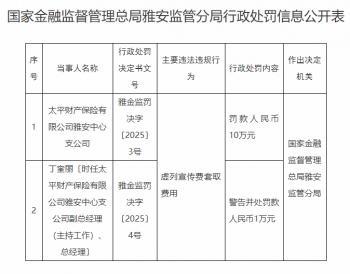 台海网11月13日讯根据国家金融监督管理总局网站近日发布的行政处罚信息公开表(雅金监罚决字〔2025〕3号、4号)显示,因虚列宣传费套取费用,国家金融监督管理总局雅安监管分局对太平财产保险有限公司雅安中心支公司罚款10万元。