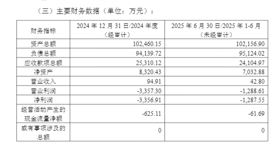 根据公告,2025年上半年,衡阳中航营收为42.80万元,净利润为-1288.61万元。截至2025年6月底,衡阳中航总资产约10.22亿元,负债约9.51亿元。2024年,该公司实现营收94.91万元,净利润-3356.91万元。