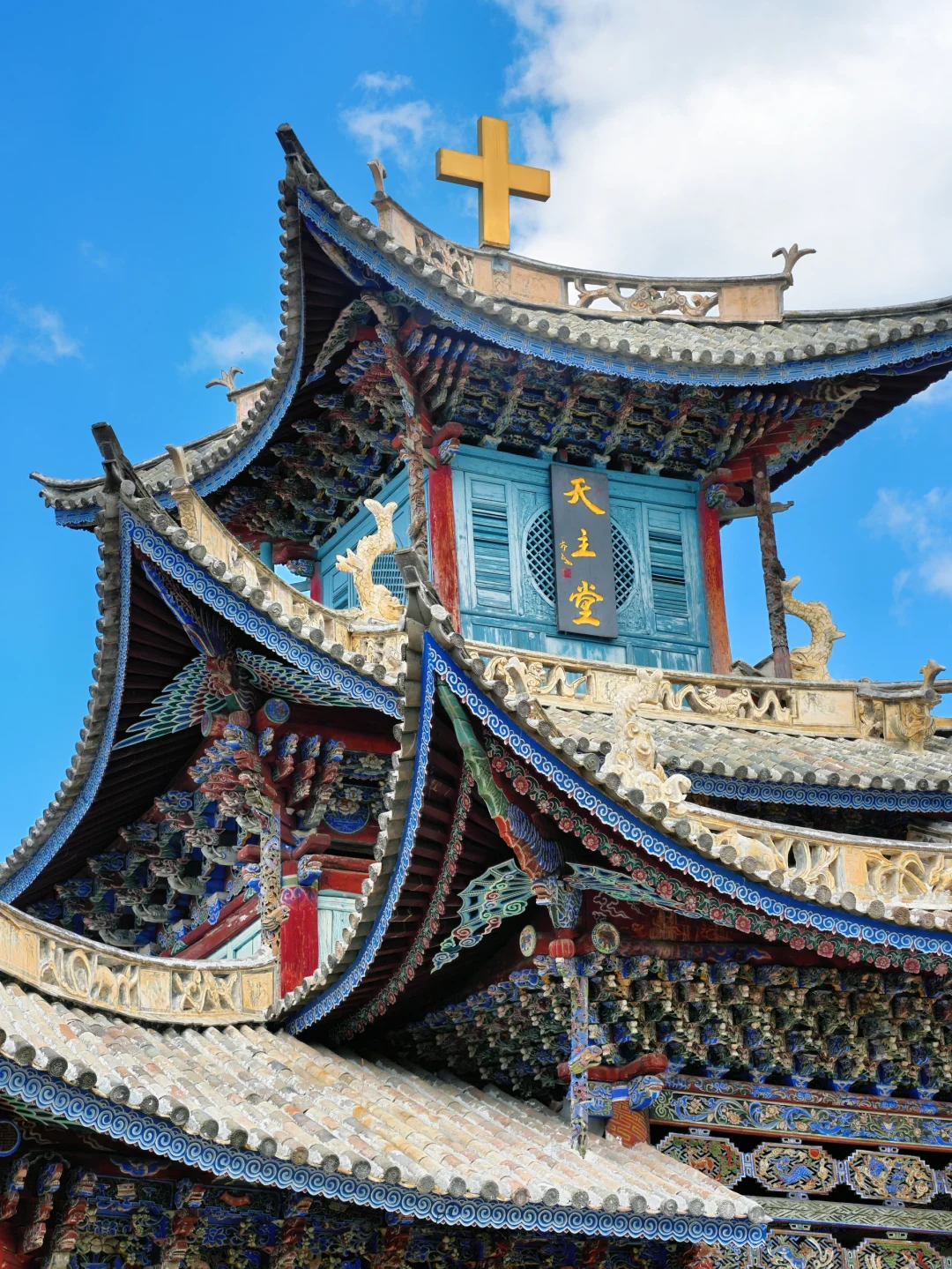 经典机位在萶苼·餐厅二楼露台可拍到与百年教堂同框,白族传统风格与西方教堂元素融合,雕梁画栋精美绝伦。