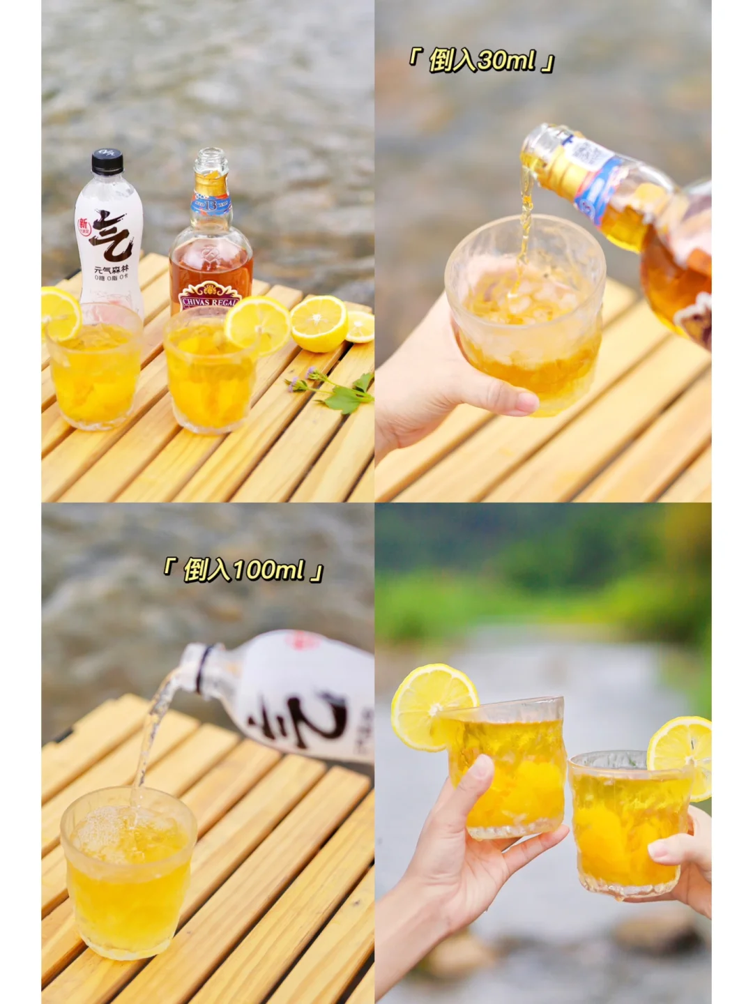 ❸ 这次溯溪露营,我们搞了点新意思,尝试做一回“调酒师”,往杯子里依次加入冰块,芝华士波本桶威士忌酒和元气森林气泡水,为了丰富口感,还特意加入了黄桃罐头果肉,自调的“鸡尾酒”整体喝起来很爽口。威士忌的口感很柔润,顺滑回味,搭配0糖0脂0卡的气泡水,清爽又get微醺的快乐,非常有夏天的味道