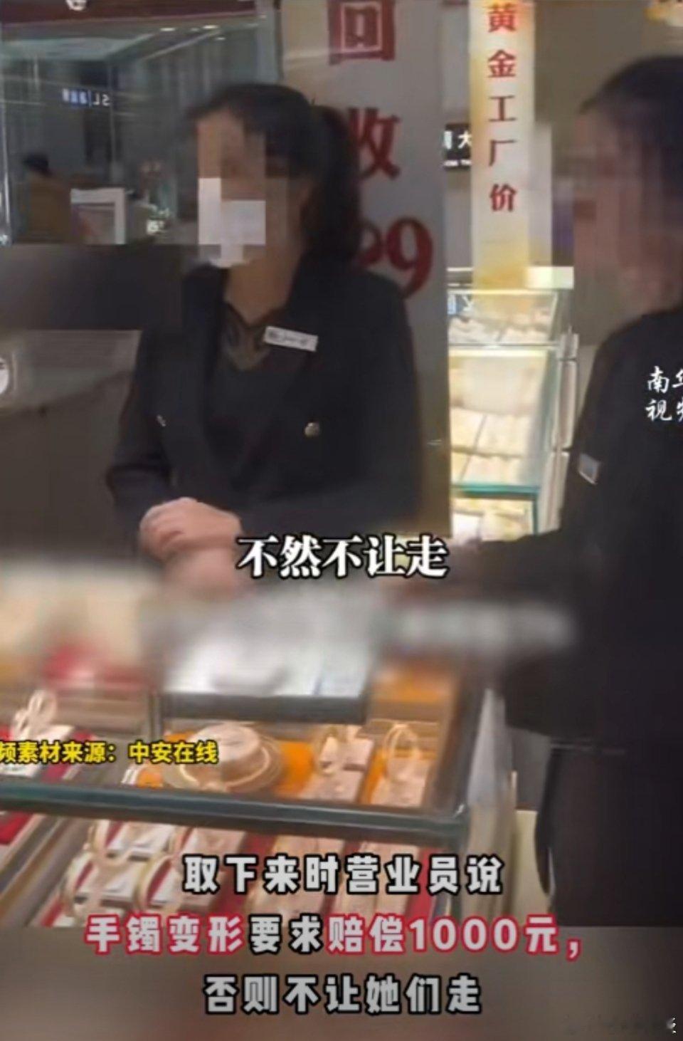 这已经算是强卖了吧,小孩试戴了金镯子仅十秒钟,营业员说镯子变形了,要求顾客要么买走,要么赔偿1000元