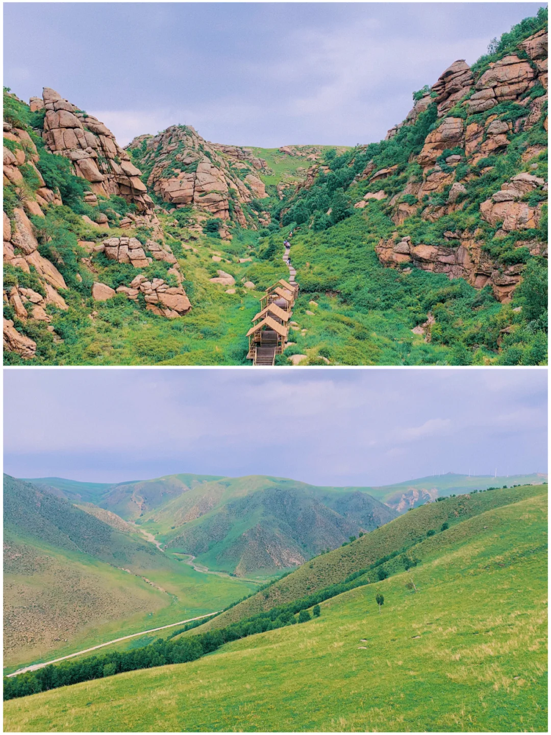 黄花沟其实也是属于辉腾锡勒草原的一部分,不同的是,黄花沟有更多怪状独特的山石。而且能再更高峰去俯瞰景色,也是超级美的哦~