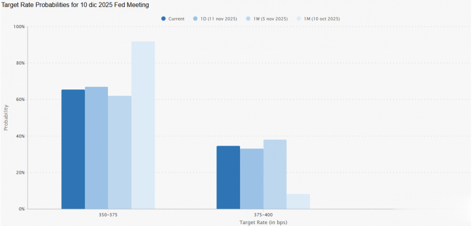 距离12月10日美联储货币政策决议仅剩不足一月,CME集团概率模型显示市场仍预期将降息0.25%,基准利率从而从4.00%降至3.75%。虽然一个月前这种降息概率超过90%,现已缓和至65%,但仍反映市场对美联储下次会议年底前降息的强烈预期。