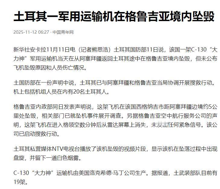 土耳其军机空中解体,拦腰断成两截,转着圈掉进山区   11号那天,格鲁吉亚和阿塞拜疆边境的天上,出了件让人揪心的事。雷达上好好的一个光点,突然就没影了,山里跟着传来巨响,还有一道转着圈往下掉的白烟,土耳其一架C-130“大力神”运输机,刚从阿塞拜疆飞回来准备回土耳其,好好的飞机突然就不行了,拦腰断成两截,转着圈砸进了山里,机上20个土耳其人,一个都没活下来。   这可不是电影里编的,是土耳其私营媒体NTV实打实拍着的。这架运输机刚进入格鲁吉亚领空没几分钟,就从雷达上凭空消失了。更邪门的是,地面塔台从头至尾都没收到过它的紧急求救信号。等搜救队找到残骸的时候,金属碎片撒了一大片,连机身主体都碎得不成样,你想想那空中解体的冲击力得有多吓人。   这消息从模糊到清楚,一路都让人提着心。土耳其国防部11号最先确认了坠机的事,但没说有没有人伤亡,只说已经跟格鲁吉亚、阿塞拜疆协调着搜救。直到12号,国防部长居莱尔才在社交平台上难过地宣布,机上20名土耳其士兵全没了。   同一天,土耳其总统埃尔多安也没闲着,赶紧给阿塞拜疆总统阿利耶夫、格鲁吉亚总理科巴希泽打电话对接情况,公开活动里还为遇难者默哀,整个土耳其都浸在难过里。   现在坠机现场那边,土耳其的事故调查小组正和格鲁吉亚的人一起查残骸,想弄明白到底咋回事。目前能确定的细节没多少:飞机是从阿塞拜疆往土耳其本土飞的;坠毁的地方在格鲁吉亚锡格纳吉市附近,离阿塞拜疆边境就5公里;这架C-130是美国洛克希德·马丁公司造的老机型,现在土耳其军队里还有19架同款在服役。   说起C-130“大力神”,懂点军事的都知道,这是出了名的“空中老兵”。从1960年开始服役到现在,凭着皮实耐造的本事,成了几十个国家军队的标配。当年海湾战争,美军98%的运输活儿都是它干的,就算是高温高海拔的山区,它也能扛。可这么靠谱的飞机,咋会在好好的航程里突然散架呢?   现在官方还没给说法,但有几个细节挺值得琢磨。首先是“没发紧急信号”这事儿,要是机械出问题,飞行员一般都有时间求救;要是碰上个突发坏天气,雷达也该能扫到异常。再就是“拦腰折断”这种解体方式,通常跟机身结构受损有关,可能是金属用久了疲劳,也可能是空中撞上了啥不明东西,但到底是哪种,还得等残骸鉴定完、黑匣子数据读出来才知道。   现在三个国家都动起来了,格鲁吉亚的搜救队最先找到坠机点,土耳其的调查小组连夜赶了过去,阿塞拜疆也在帮忙查这架飞机在本国停留时的状态。对土耳其来说,这不光是丢了20条人命那么简单,更给自家现役装备的维护提了个大醒。C-130再结实,也有用坏的时候,常年飞跨国任务,机身耗损和定期检查真的一点都不能马虎。   到现在,事故原因还藏在那些散落的残骸里,但20条生命没了,这事儿已经够重了。这场边境山区的空难,也让三个国家暂时放下了外交上的小摩擦,全都扑在善后和调查上。毕竟在生命面前,那些分歧都得给真相和哀悼让路。   接下来大家都在等黑匣子的解读结果,等着给这20名遇难士兵和他们的家人,一个明明白白的交代。