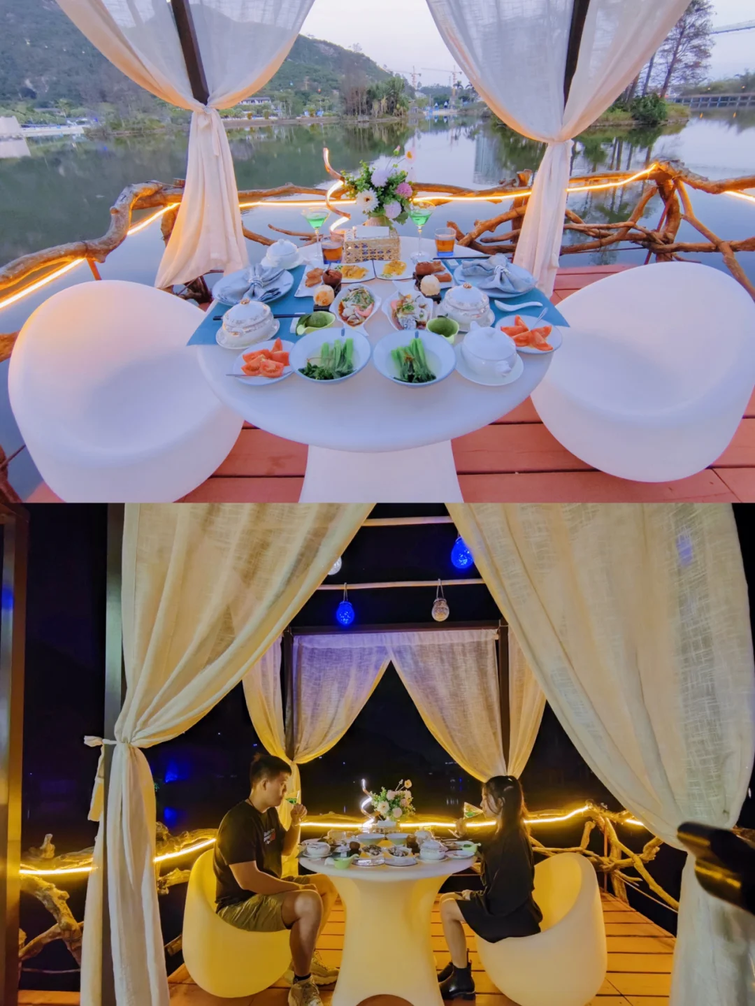 ▫️【晚餐】我们是在【柑香馆】订的陈皮主题料理,我们还很幸运的可以预约到湖边就餐,配上白色桌椅和帘子,超级浪漫💕