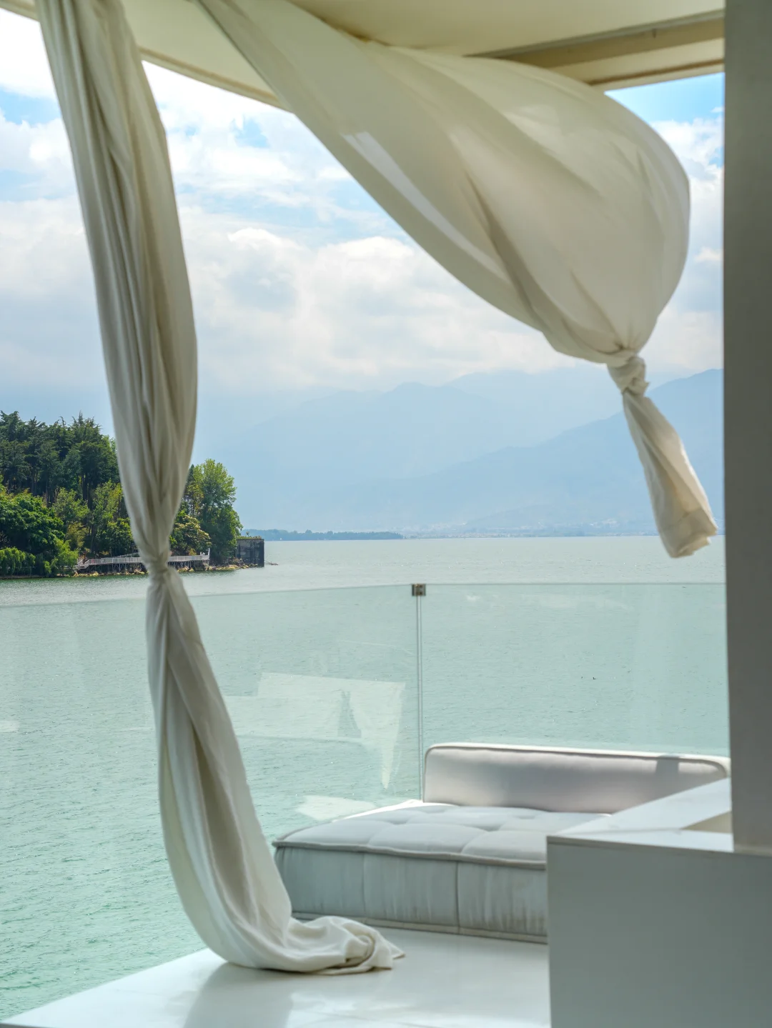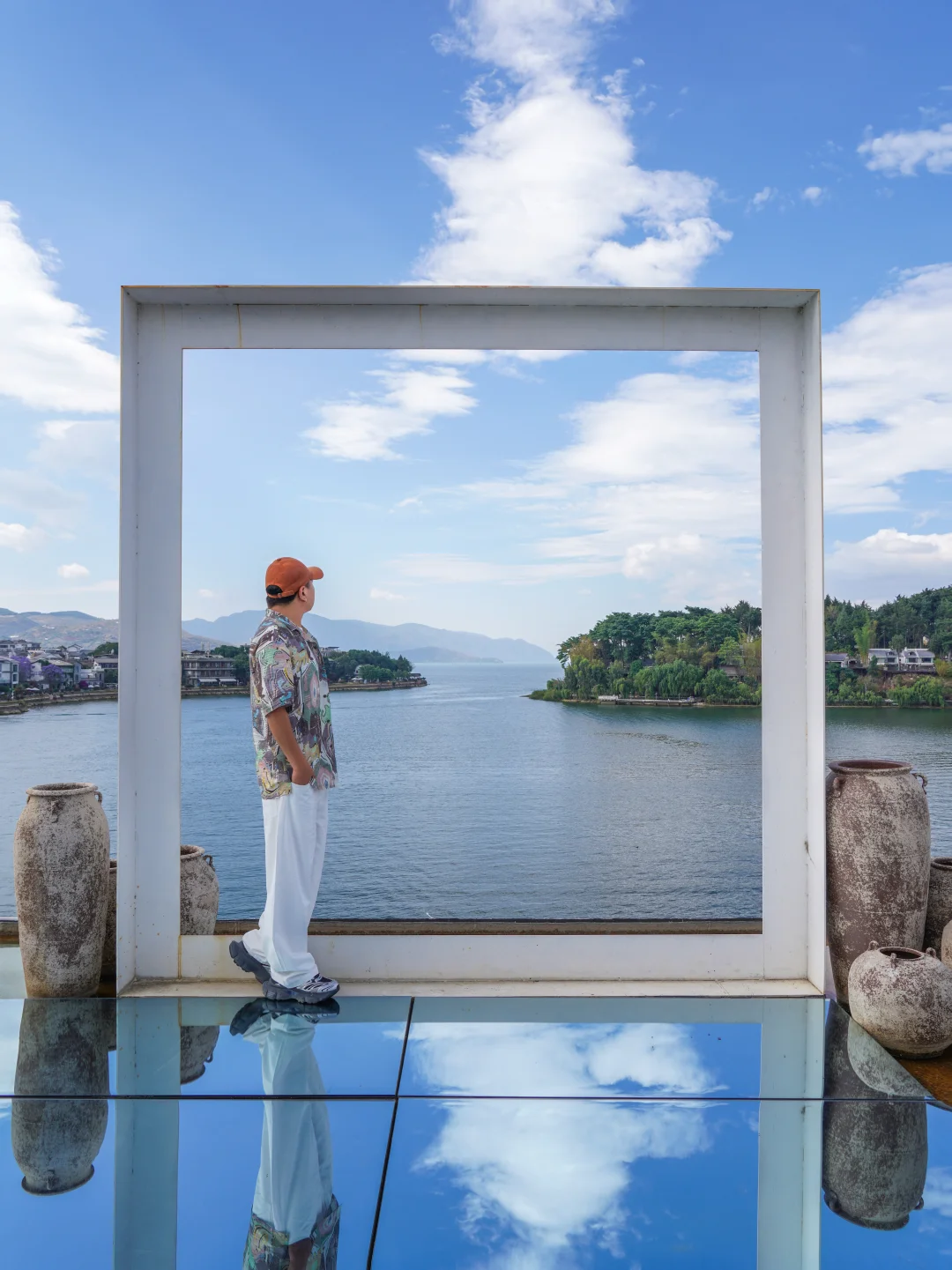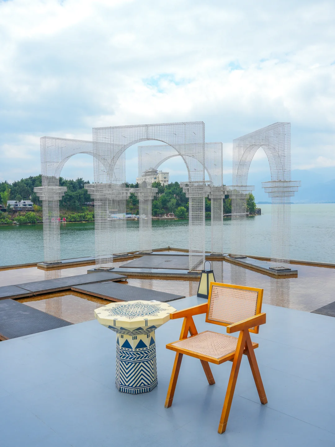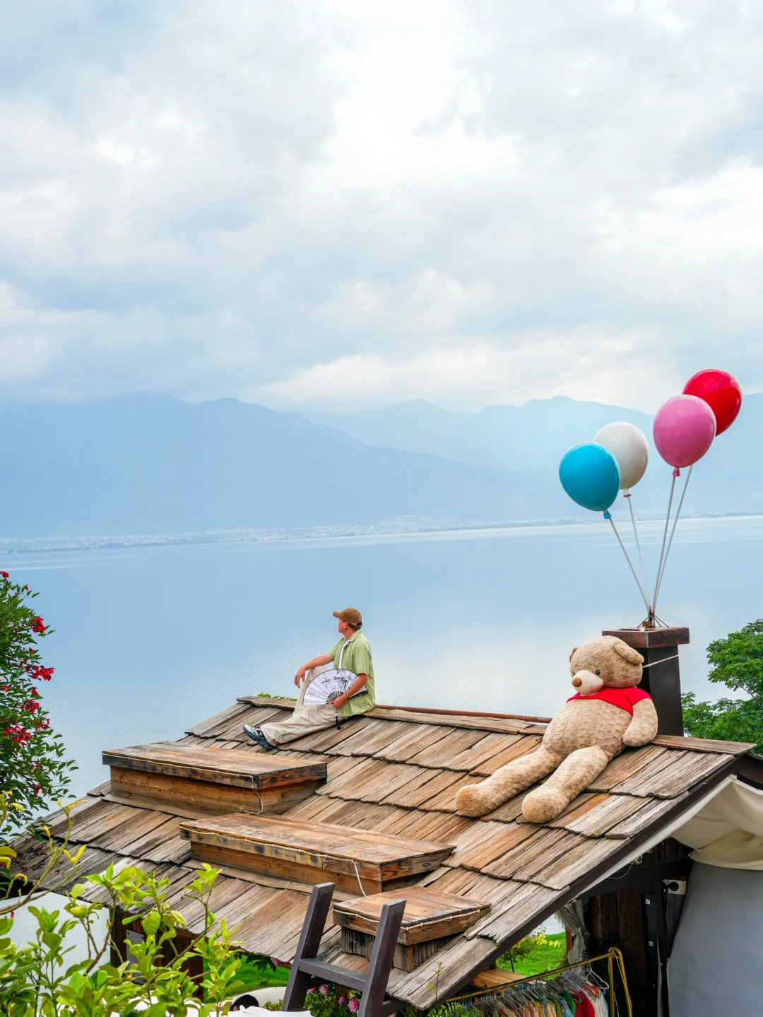 ✔️阿凯缇娅海景度假酒店天台:天台上设有很多打卡点,以洱海和蓝天为背景拍倒影,超级出片,爬上屋顶就能拍到云南特色的上房揭瓦同款机位