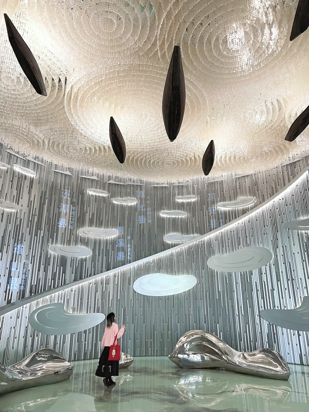 就在珍珠广场旁边,从樱花林步行过去只需3分钟圆形飞碟式建筑一共4层,一楼是介绍千岛湖民俗文化,二楼展现的是千岛湖历史和人文,三楼讲的是淳安人民的移民故事,四楼主要是介绍淳安非遗文化;