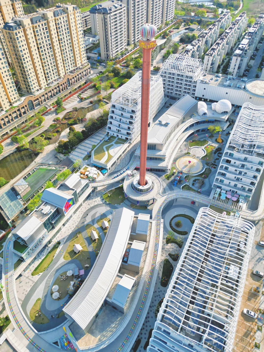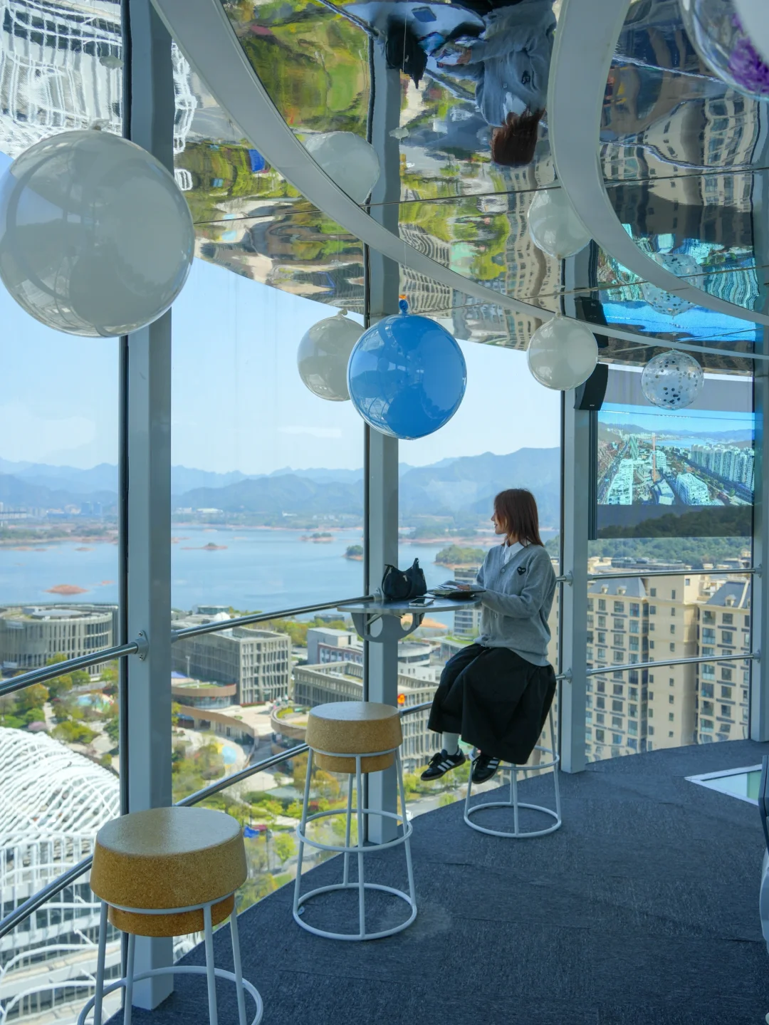 圆形铁塔高80米,360度旋转观景台缓缓上升登顶可俯瞰千岛湖及城市风光傍晚时分蓝调时刻观景巨美;